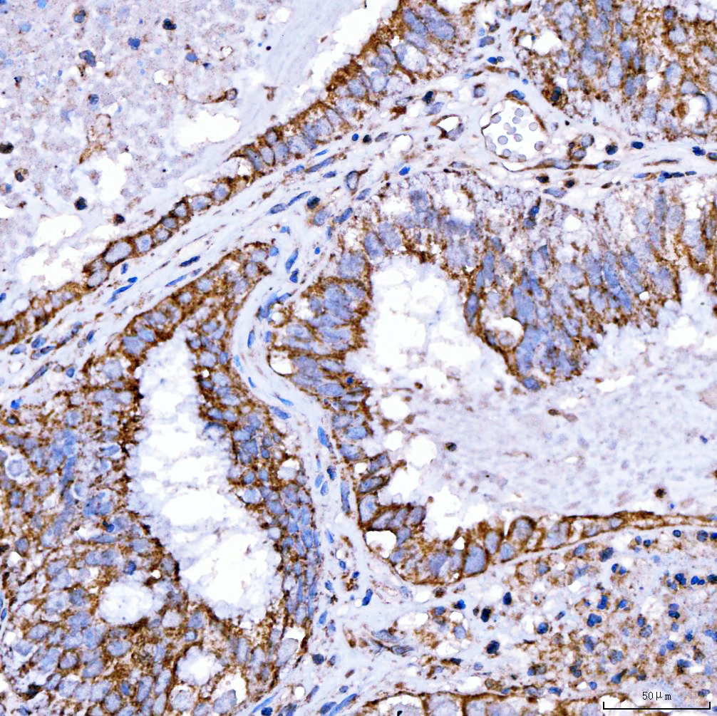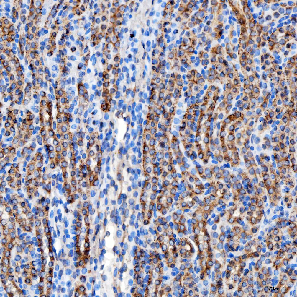 RAB7A was detected in a paraffin-embedded section of human duodenal papilla adenocarcinoma tissue. The tissue section was incubated with rabbit anti-RAB7A Antibody (A02409-1) at a dilution of 1:200 and developed using HRP Conjugated Rabbit IgG Super Vision Assay Kit (Catalog # SV0002) with DAB (Catalog # AR1027) as the chromogen.