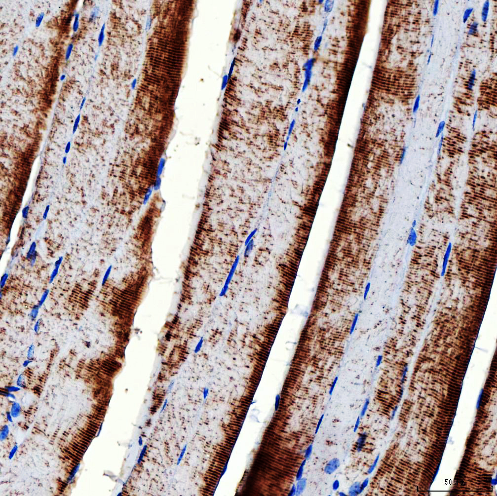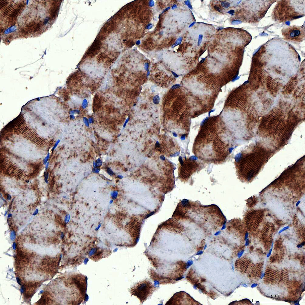 RAB7A was detected in a paraffin-embedded section of mouse skeletal muscle tissue. The tissue section was incubated with rabbit anti-RAB7A Antibody (A02409-1) at a dilution of 1:200 and developed using HRP Conjugated Rabbit IgG Super Vision Assay Kit (Catalog # SV0002) with DAB (Catalog # AR1027) as the chromogen.