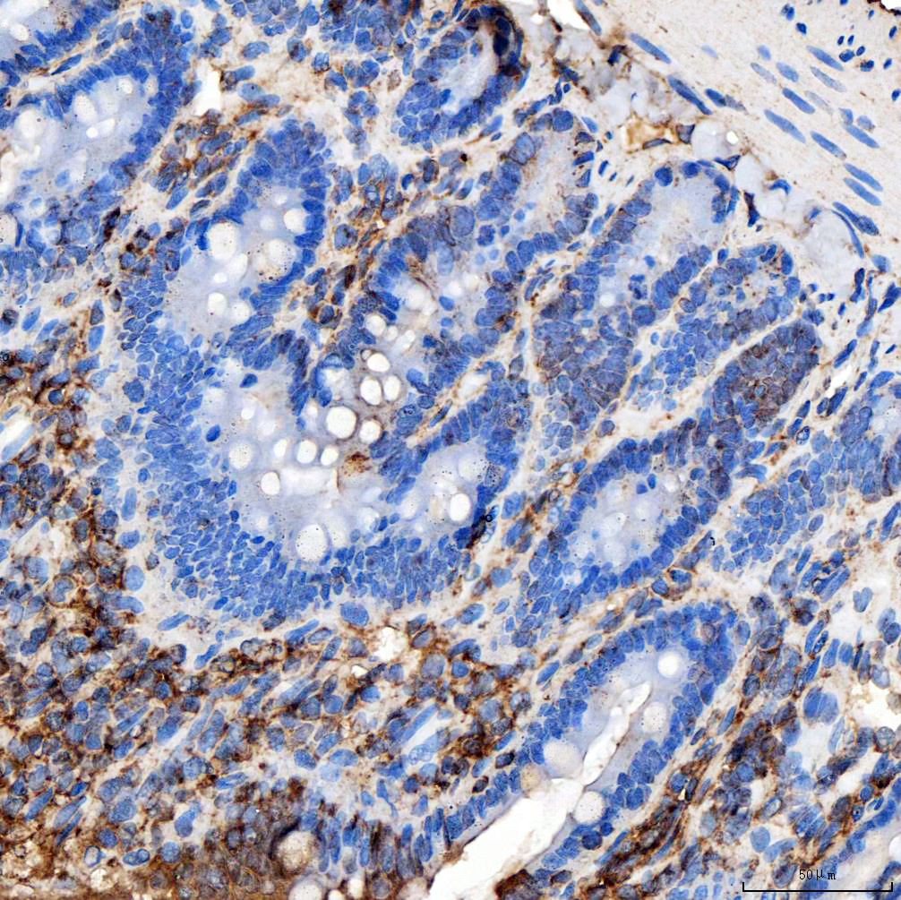 RAB7A was detected in a paraffin-embedded section of rat colon tissue. The tissue section was incubated with rabbit anti-RAB7A Antibody (A02409-1) at a dilution of 1:200 and developed using HRP Conjugated Rabbit IgG Super Vision Assay Kit (Catalog # SV0002) with DAB (Catalog # AR1027) as the chromogen.
