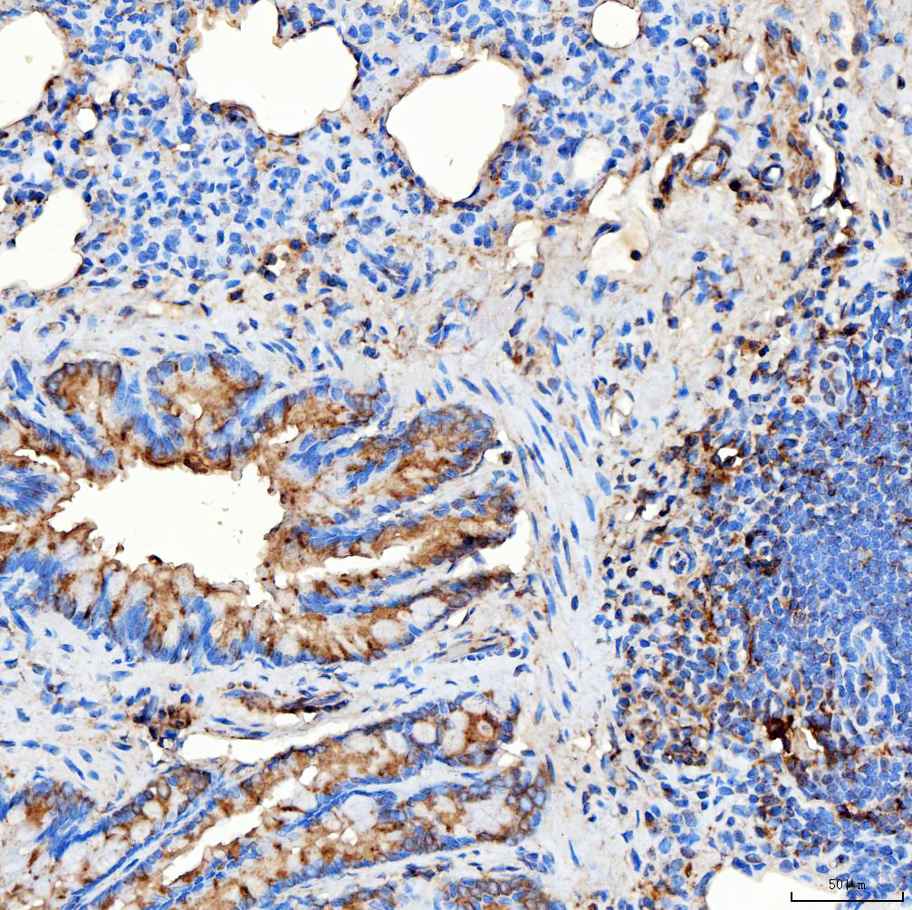 RAB7A was detected in a paraffin-embedded section of rat lung tissue. The tissue section was incubated with rabbit anti-RAB7A Antibody (A02409-1) at a dilution of 1:200 and developed using HRP Conjugated Rabbit IgG Super Vision Assay Kit (Catalog # SV0002) with DAB (Catalog # AR1027) as the chromogen.
