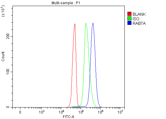 Overlay histogram showing RH-35 cells stained with A02409-1 (Blue line). To facilitate intracellular staining, cells were fixed with 4% paraformaldehyde and permeabilized with permeabilization buffer. The cells were blocked with 10% normal goat serum. And then incubated with rabbit anti-RAB7A Antibody (A02409-1) at 1:100 dilution for 30 min at 20°C. Fluoro488 conjugated goat anti-rabbit IgG (BA1127) was used as secondary antibody at 1:100 dilution for 30 minutes at 20°C. Isotype control antibody (Green line) was rabbit IgG at 1:100 dilution used under the same conditions. Unlabelled sample without incubation with primary antibody and secondary antibody (Red line) was used as a blank control.