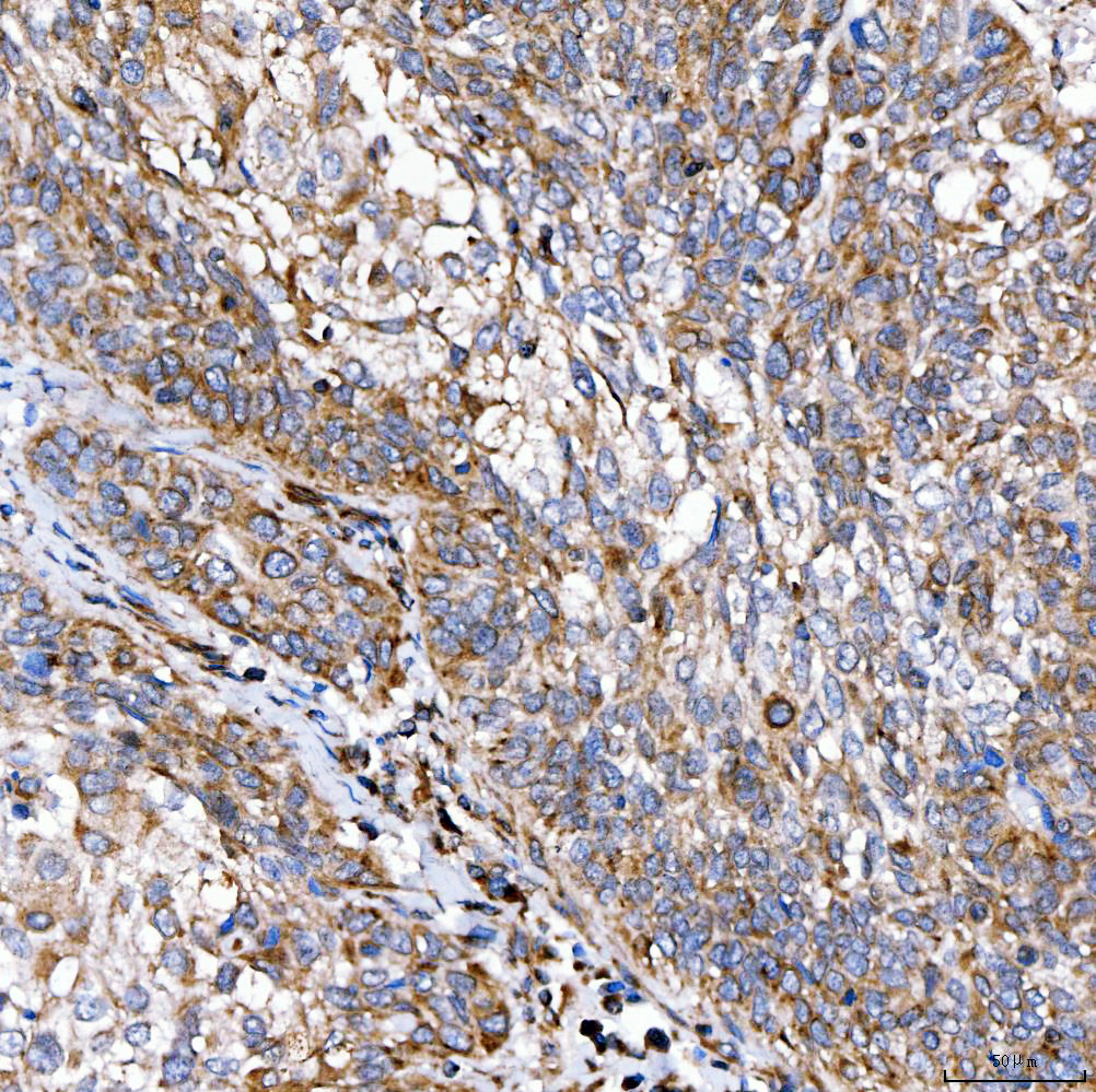 RAB7A was detected in a paraffin-embedded section of human larynx squamous cell carcinoma tissue. The tissue section was incubated with rabbit anti-RAB7A Antibody (A02409-1) at a dilution of 1:200 and developed using HRP Conjugated Rabbit IgG Super Vision Assay Kit (Catalog # SV0002) with DAB (Catalog # AR1027) as the chromogen.