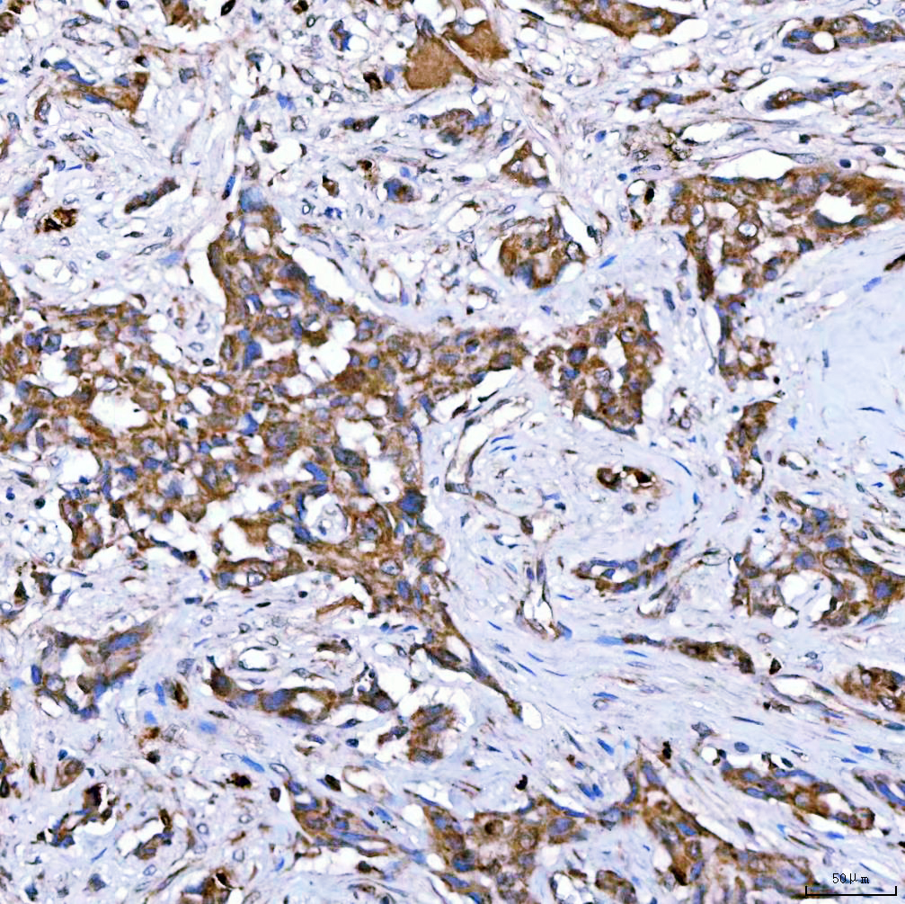 RAB7A was detected in a paraffin-embedded section of human lung adenocarcinoma tissue. The tissue section was incubated with rabbit anti-RAB7A Antibody (A02409-1) at a dilution of 1:200 and developed using HRP Conjugated Rabbit IgG Super Vision Assay Kit (Catalog # SV0002) with DAB (Catalog # AR1027) as the chromogen.