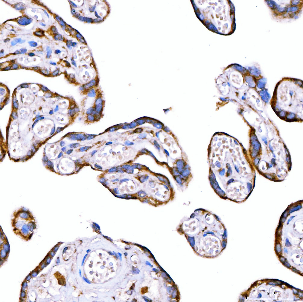 RAB7A was detected in a paraffin-embedded section of human placenta tissue. The tissue section was incubated with rabbit anti-RAB7A Antibody (A02409-1) at a dilution of 1:200 and developed using HRP Conjugated Rabbit IgG Super Vision Assay Kit (Catalog # SV0002) with DAB (Catalog # AR1027) as the chromogen.