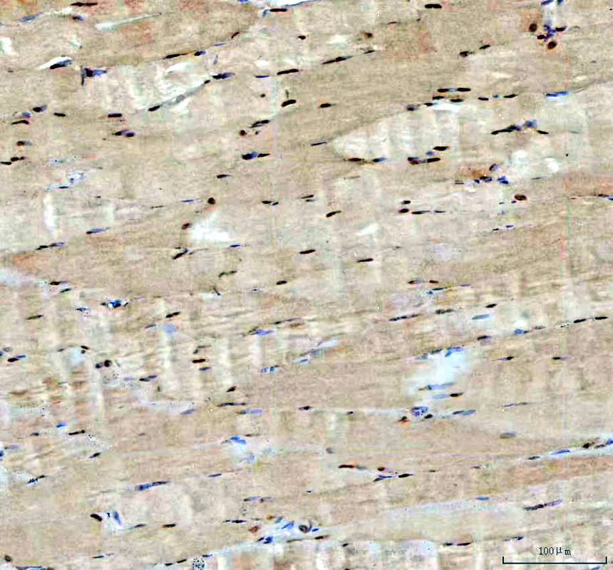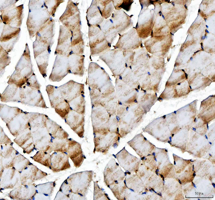 Acetyl CoA synthetase/ACSS2 was detected in a paraffin-embedded section of human skeletal muscle tissue. The tissue section was incubated with rabbit anti-Acetyl CoA synthetase/ACSS2 Antibody (A02809-1) at a dilution of 1:200 and developed using HRP Conjugated Rabbit IgG Super Vision Assay Kit (Catalog # SV0002) with DAB (Catalog # AR1027) as the chromogen.