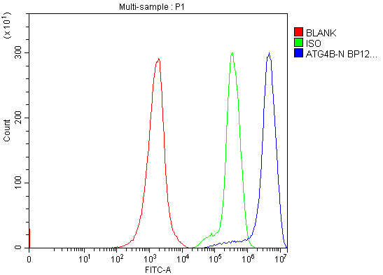 Overlay histogram showing Jurkat cells stained with A02885-1 (Blue line). To facilitate intracellular staining, cells were fixed with 4% paraformaldehyde and permeabilized with permeabilization buffer. The cells were blocked with 10% normal goat serum. And then incubated with rabbit anti-ATG4B Antibody (A02885-1) at 1:100 dilution for 30 min at 20°C. Fluoro488 conjugated goat anti-rabbit IgG (BA1127) was used as secondary antibody at 1:100 dilution for 30 minutes at 20°C. Isotype control antibody (Green line) was rabbit IgG at 1:100 dilution used under the same conditions. Unlabelled sample without incubation with primary antibody and secondary antibody (Red line) was used as a blank control.