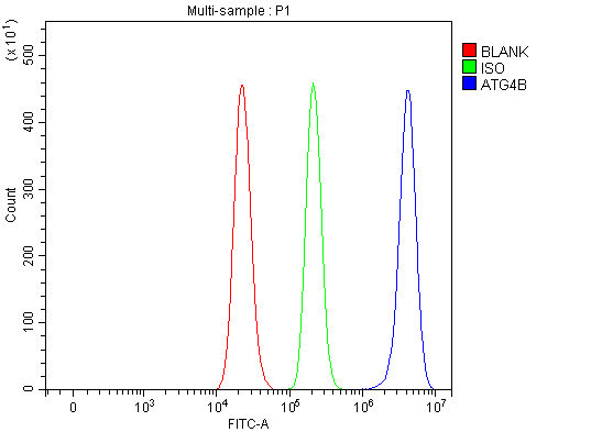 Overlay histogram showing RT4 cells stained with A02885-2 (Blue line). To facilitate intracellular staining, cells were fixed with 4% paraformaldehyde and permeabilized with permeabilization buffer. The cells were blocked with 10% normal goat serum. And then incubated with rabbit anti-ATG4B Antibody (A02885-2) at 1:100 dilution for 30 min at 20°C. Fluoro488 conjugated goat anti-rabbit IgG (BA1127) was used as secondary antibody at 1:100 dilution for 30 minutes at 20°C. Isotype control antibody (Green line) was rabbit IgG at 1:100 dilution used under the same conditions. Unlabelled sample without incubation with primary antibody and secondary antibody (Red line) was used as a blank control.