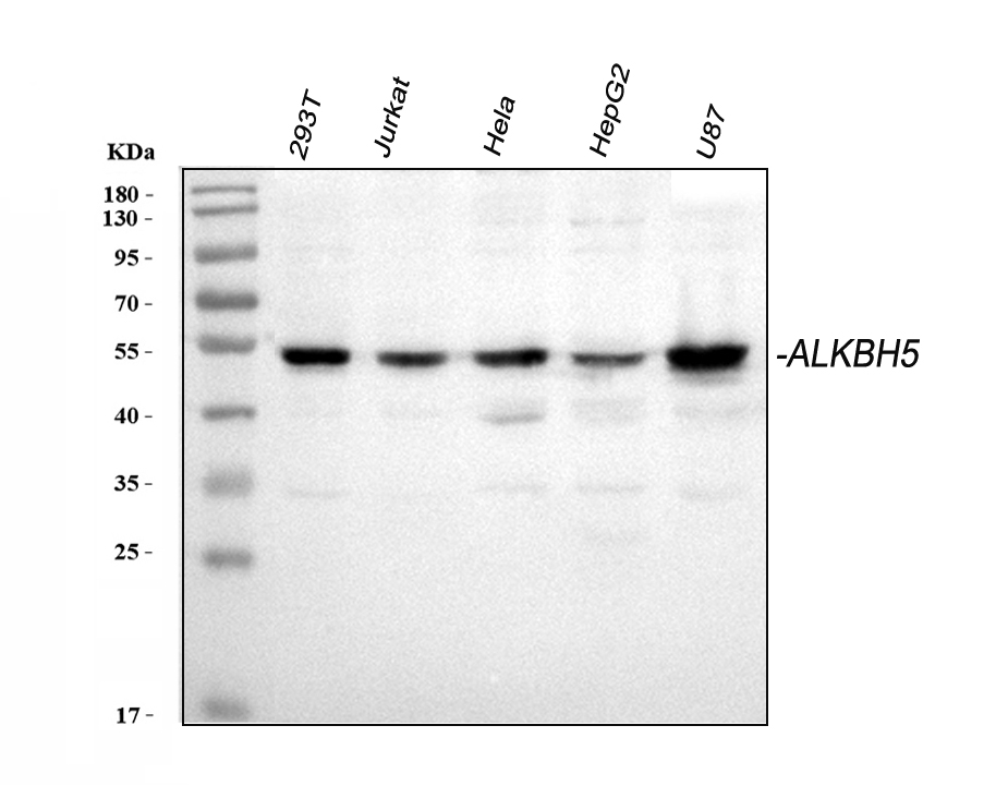 Use rabbit anti- ALKBH5 1:1000, probed with a goat anti-rabbit IgG-HRP secondary antibody. The signal is developed using an Enhanced Chemiluminescent detection (ECL) kit (Catalog#EK1002). A specific band was detected for ALKBH5 at approximately 52KD. The expected band size for ALKBH5 is at 44KD.