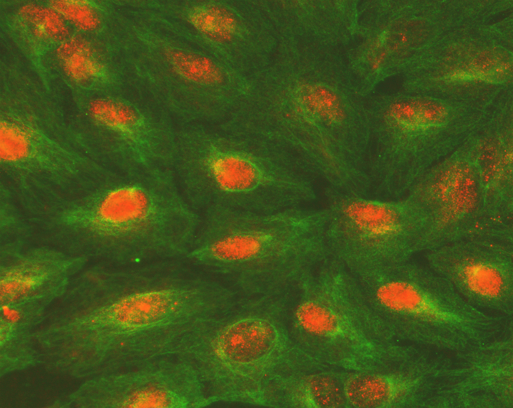 ALKBH5 was detected in an immunocytochemical section of A549 cells. The section was incubated with rabbit anti-ALKBH5 Antibody (A03360) at a dilution of 1:100. Cy3-conjugated Anti-rabbit IgG Secondary Antibody (red)(Catalog#BA1032) and Fluoro488-conjugated Anti-mouse IgG Secondary Antibody (Green) (Catalog # BA1126) were used as secondary antibody.