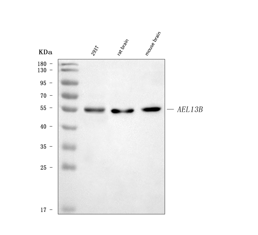 After electrophoresis, proteins were transferred to a membrane. Then the membrane was incubated with rabbit anti-ARL13B antigen affinity purified polyclonal antibody (A04279-1) at a dilution of 1:1000 and probed with a goat anti-rabbit IgG-HRP secondary antibody (Catalog # BA1054). The signal is developed using ECL Plus Western Blotting Substrate (Catalog # AR1197). A specific band was detected for ARL13B at approximately 55 kDa. The expected band size for ARL13B is at 49 kDa.
