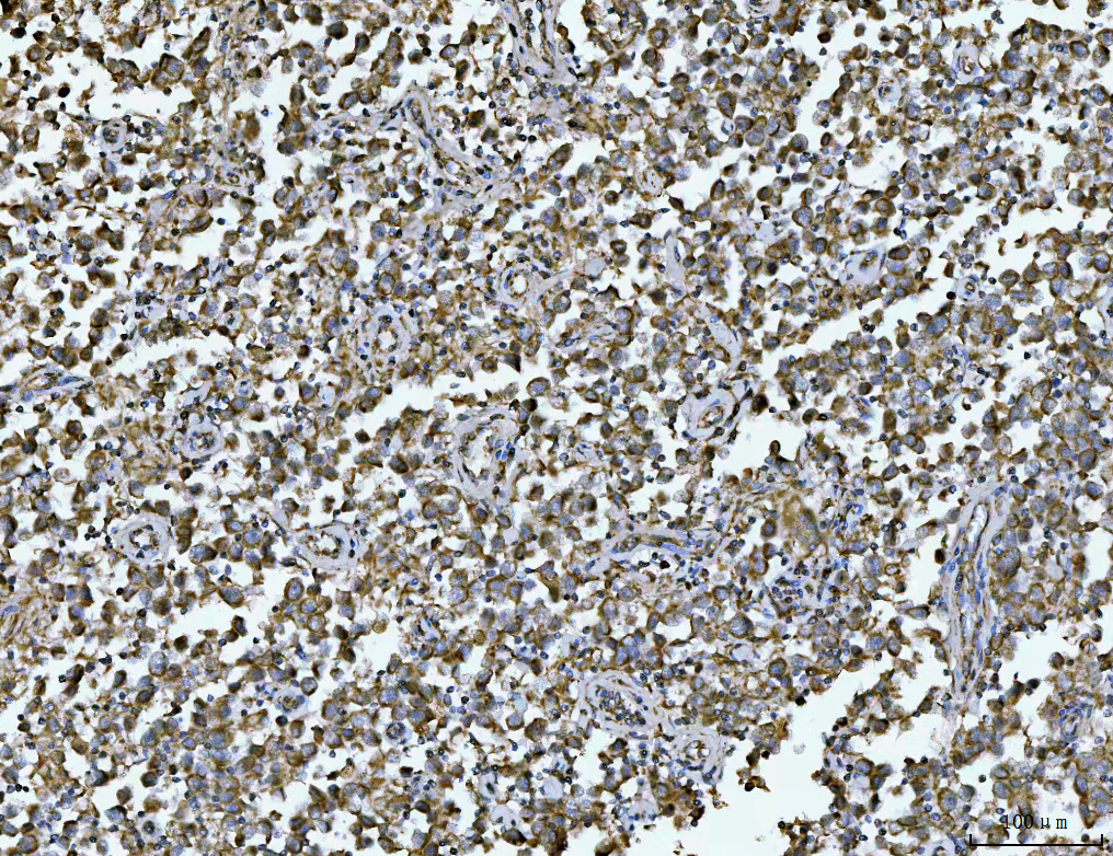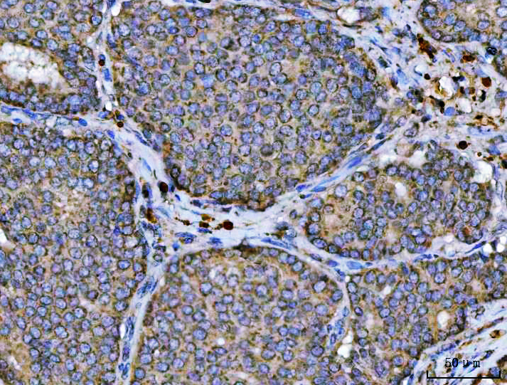 ARL13B was detected in a paraffin-embedded section of human testicular cancer tissue. Biotinylated goat anti-rabbit IgG was used as secondary antibody. The tissue section was incubated with rabbit anti-ARL13B Antibody (A04279-1) at a dilution of 1:200 and developed using Strepavidin-Biotin-Complex (SABC) (Catalog # SA1022) with DAB (Catalog # AR1027) as the chromogen.