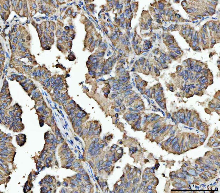 ARL13B was detected in a paraffin-embedded section of human colorectal adenocarcinoma tissue. Biotinylated goat anti-rabbit IgG was used as secondary antibody. The tissue section was incubated with rabbit anti-ARL13B Antibody (A04279-1) at a dilution of 1:200 and developed using Strepavidin-Biotin-Complex (SABC) (Catalog # SA1022) with DAB (Catalog # AR1027) as the chromogen.