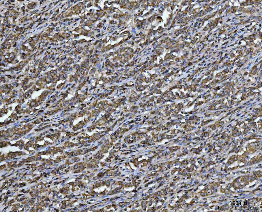 ARL13B was detected in a paraffin-embedded section of human gastric carcinoma tissue. Biotinylated goat anti-rabbit IgG was used as secondary antibody. The tissue section was incubated with rabbit anti-ARL13B Antibody (A04279-1) at a dilution of 1:200 and developed using Strepavidin-Biotin-Complex (SABC) (Catalog # SA1022) with DAB (Catalog # AR1027) as the chromogen.
