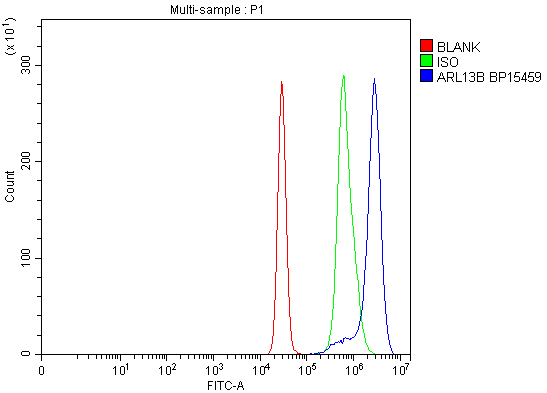 Overlay histogram showing K562 cells stained with A04279-1 (Blue line). To facilitate intracellular staining, cells were fixed with 4% paraformaldehyde and permeabilized with permeabilization buffer. The cells were blocked with 10% normal goat serum. And then incubated with rabbit anti-ARL13B Antibody (A04279-1) at 1:100 dilution for 30 min at 20°C. Fluoro488 conjugated goat anti-rabbit IgG (BA1127) was used as secondary antibody at 1:100 dilution for 30 minutes at 20°C. Isotype control antibody (Green line) was rabbit IgG at 1:100 dilution used under the same conditions. Unlabelled sample without incubation with primary antibody and secondary antibody (Red line) was used as a blank control.