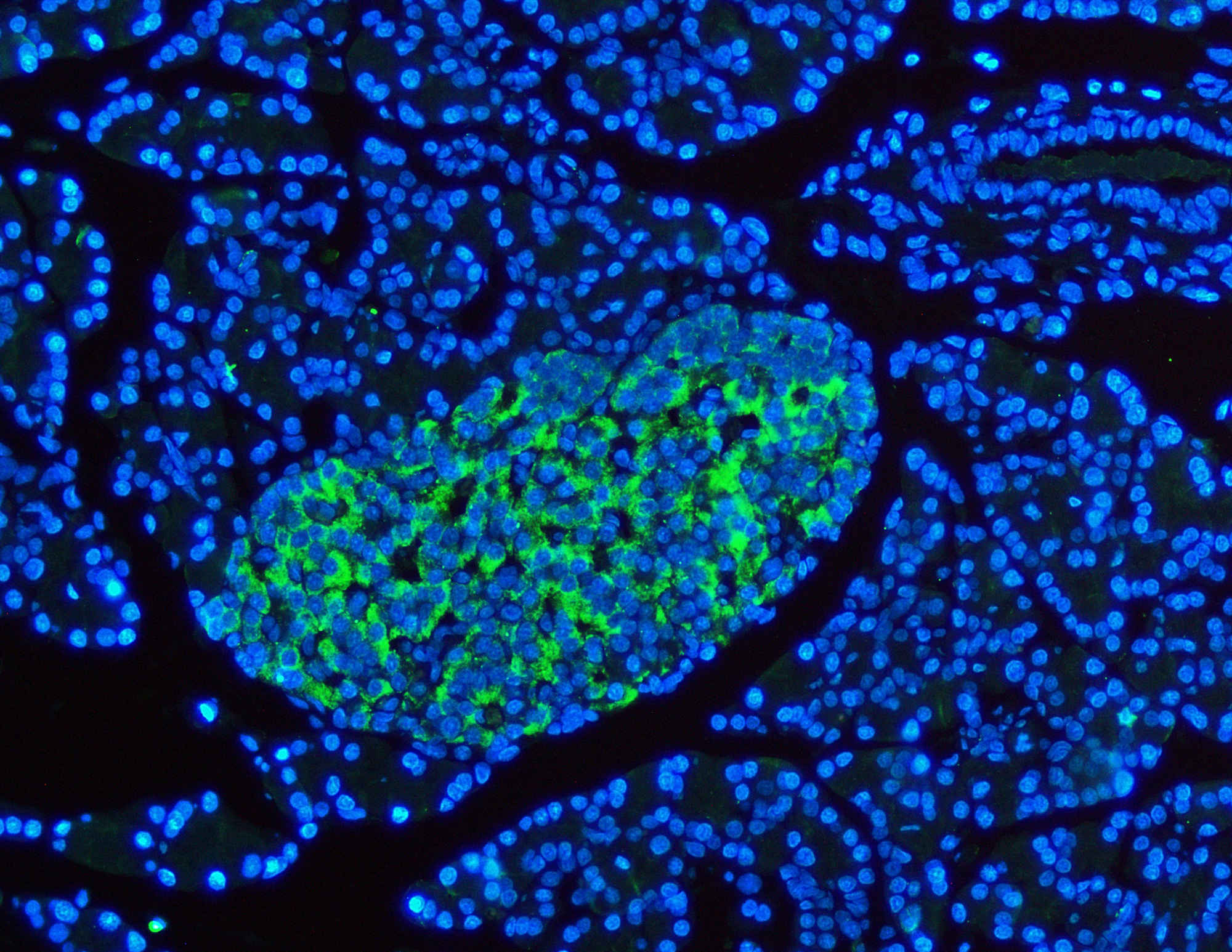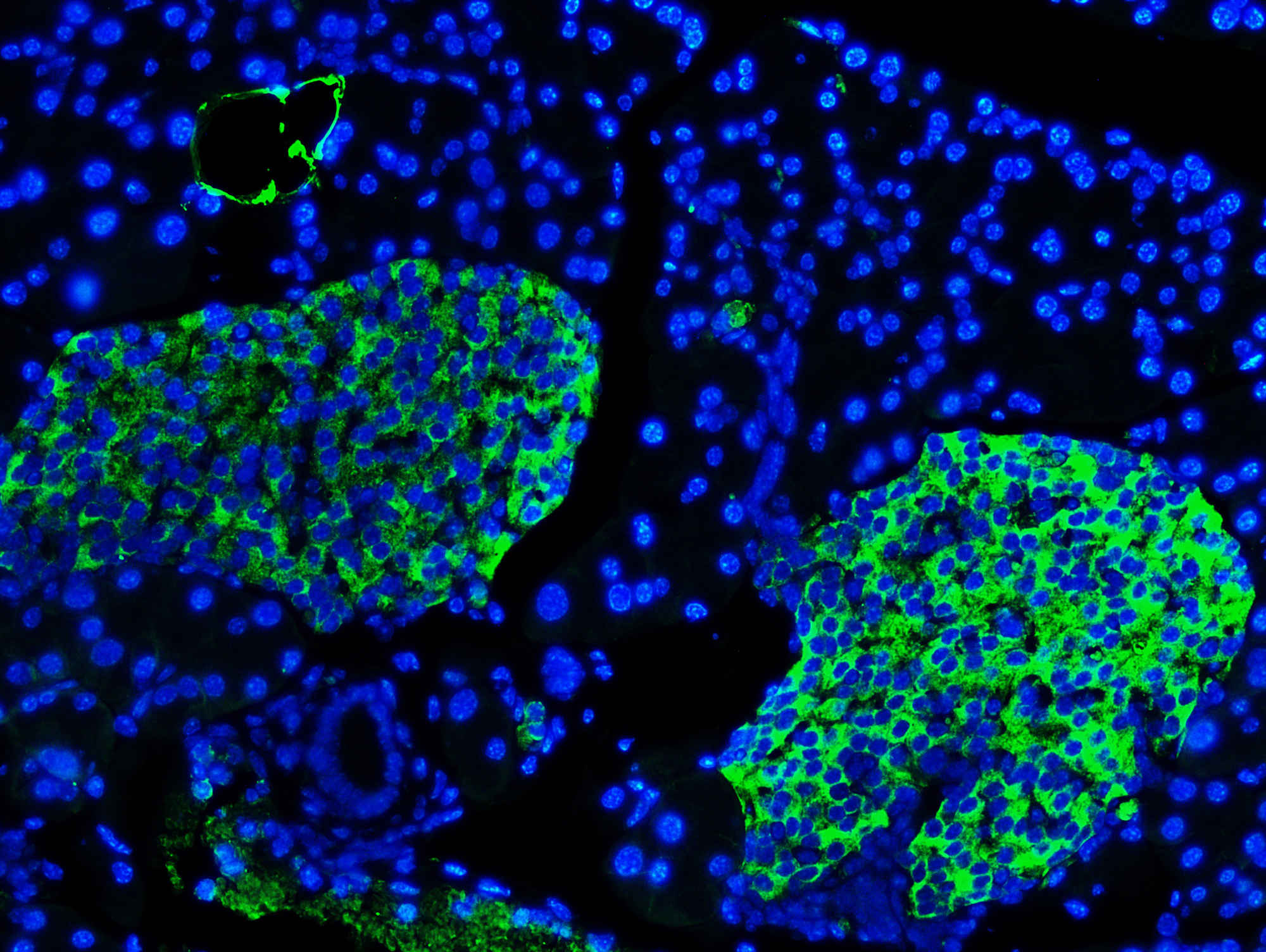 IF analysis using anti- SYP antibody (A05049). detected in paraffin-embedded section of rat pancreas tissue. The tissue section were stained using the Fluoro488-conjugated Anti-rabbit IgG Secondary Antibody (green) (Catalog # BA1127) and counterstained with DAPI (blue).