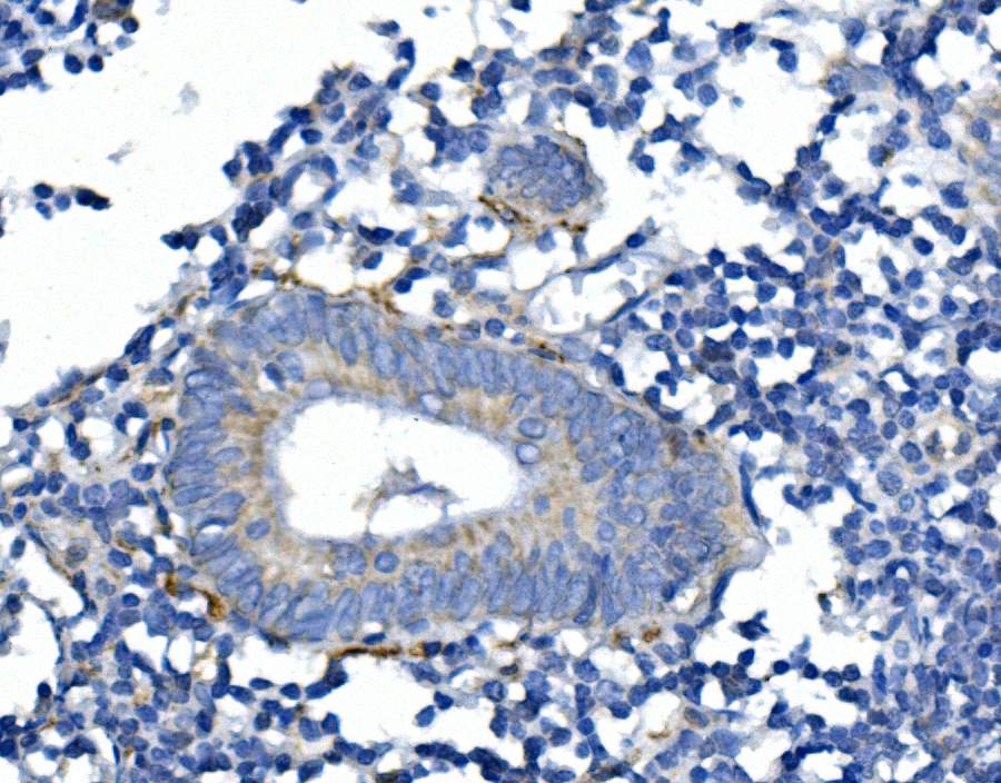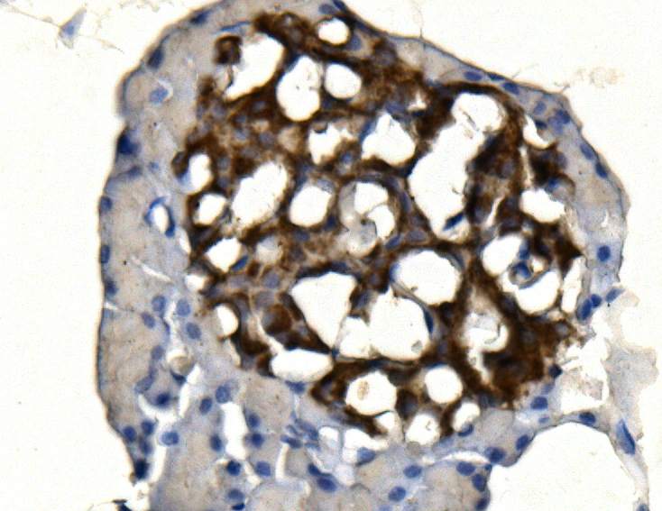 Synaptophysin/SYP was detected in a paraffin-embedded section of mouse pancreas tissue. Biotinylated goat anti-rabbit IgG was used as secondary antibody. The tissue section was incubated with rabbit anti-Synaptophysin/SYP Antibody (A05049) at a dilution of 1:200 and developed using Strepavidin-Biotin-Complex (SABC) (Catalog # SA1022) with DAB (Catalog # AR1027) as the chromogen.