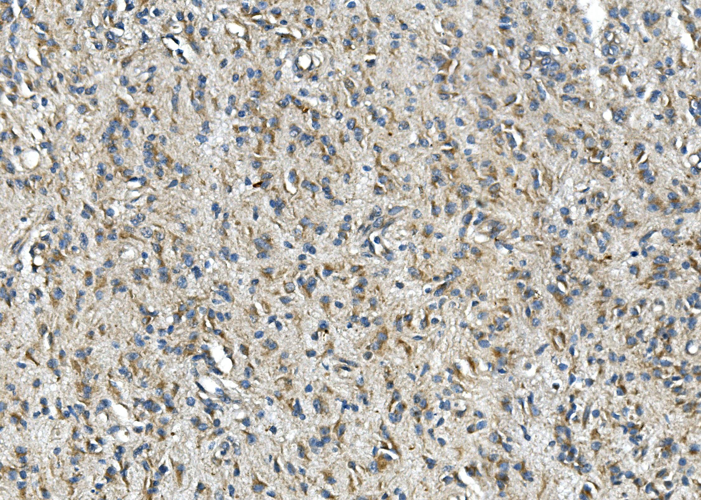 Synaptophysin/SYP was detected in a paraffin-embedded section of human glioma tissue. Biotinylated goat anti-rabbit IgG was used as secondary antibody. The tissue section was incubated with rabbit anti-Synaptophysin/SYP Antibody (A05049) at a dilution of 1:200 and developed using Strepavidin-Biotin-Complex (SABC) (Catalog # SA1022) with DAB (Catalog # AR1027) as the chromogen.