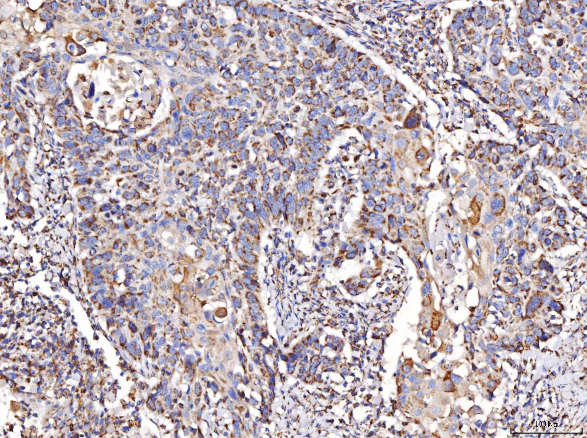COX4I1 was detected in a paraffin-embedded section of human Laryngeal squamous cell carcinomas tissue. Biotinylated goat anti-rabbit IgG was used as secondary antibody. The tissue section was incubated with rabbit anti-COX4I1 Antibody (A05442-2) at a dilution of 1:200 and developed using Strepavidin-Biotin-Complex (SABC) (Catalog # SA1022) with DAB (Catalog # AR1027) as the chromogen.