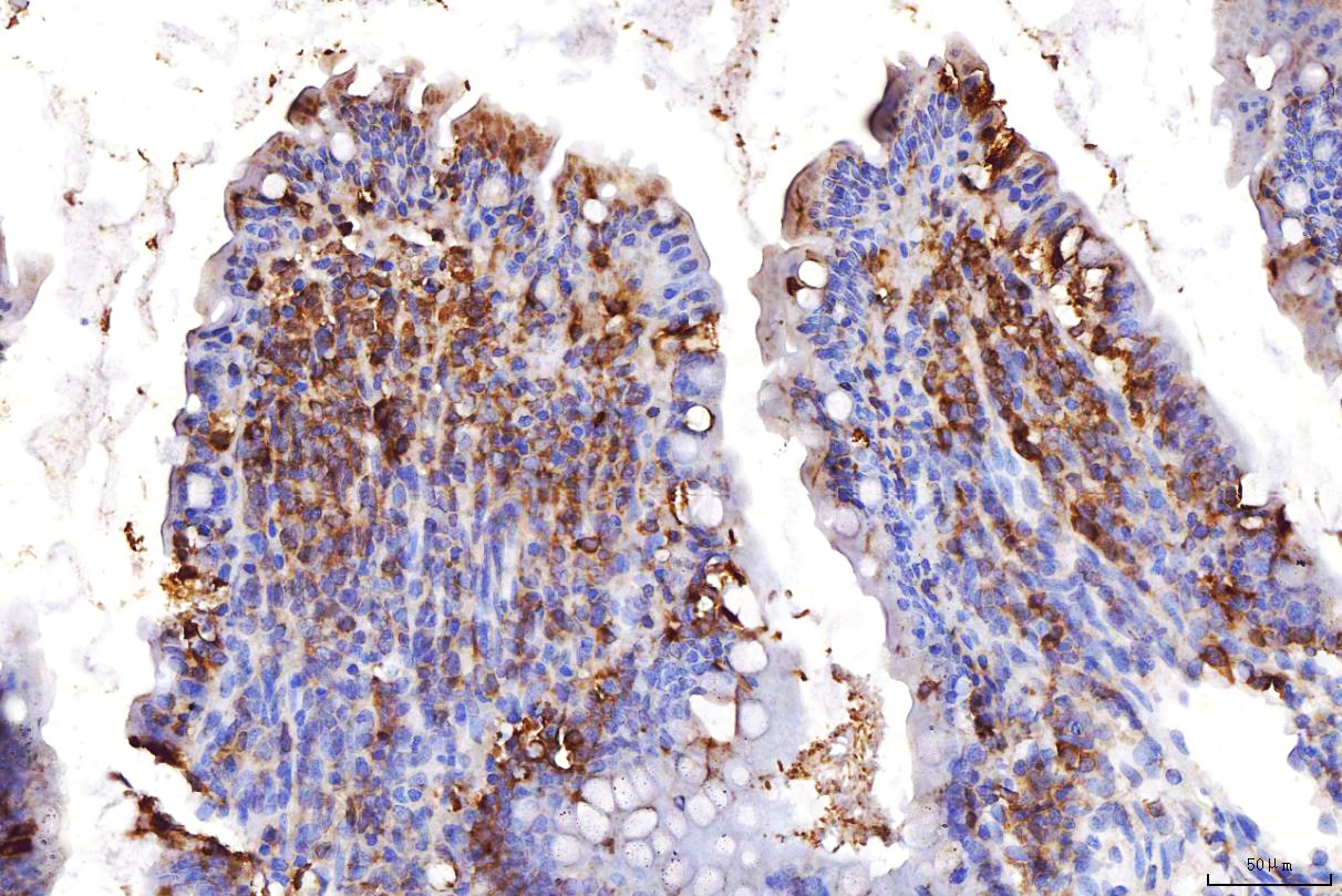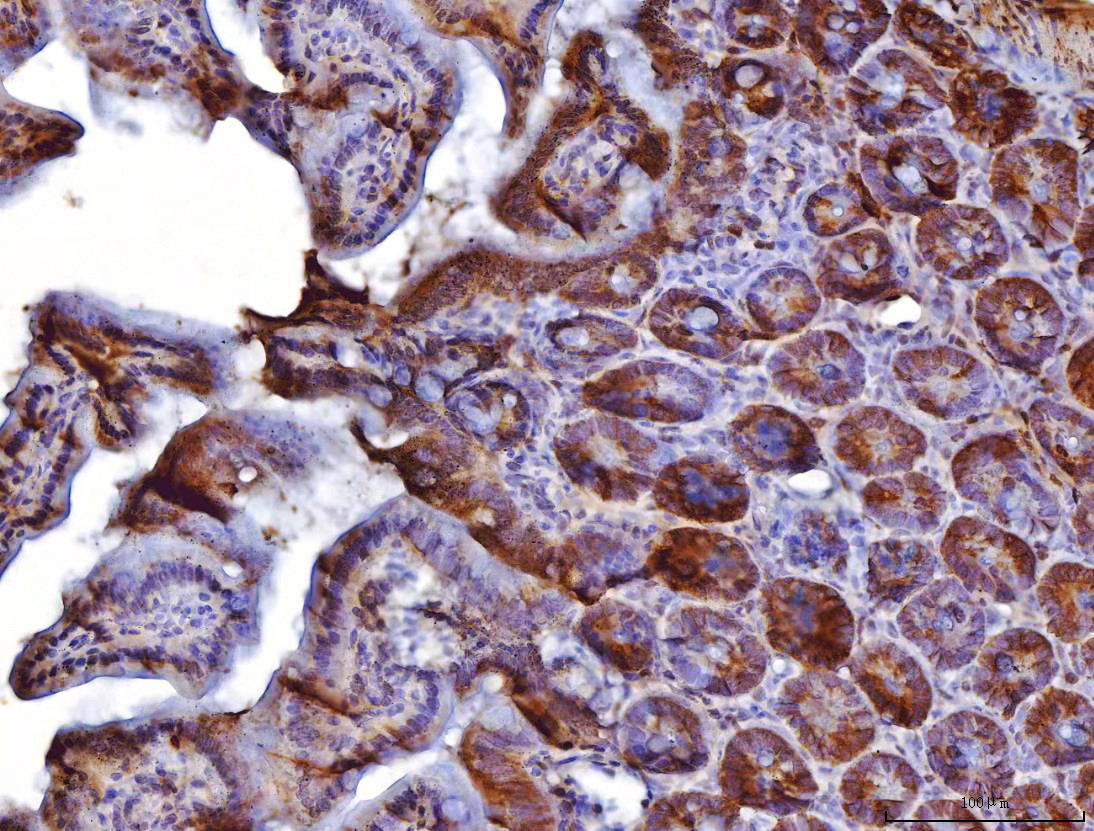 COX4I1 was detected in a paraffin-embedded section of mouse colon tissue. Biotinylated goat anti-rabbit IgG was used as secondary antibody. The tissue section was incubated with rabbit anti-COX4I1 Antibody (A05442-2) at a dilution of 1:200 and developed using Strepavidin-Biotin-Complex (SABC) (Catalog # SA1022) with DAB (Catalog # AR1027) as the chromogen.