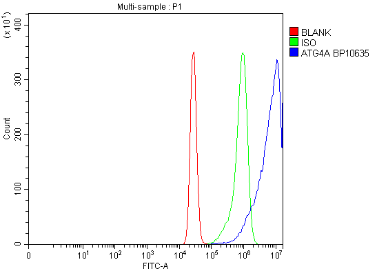 Overlay histogram showing K562 cells stained with A06539-3 (Blue line). To facilitate intracellular staining, cells were fixed with 4% paraformaldehyde and permeabilized with permeabilization buffer. The cells were blocked with 10% normal goat serum. And then incubated with rabbit anti-ATG4A Antibody (A06539-3) at 1:100 dilution for 30 min at 20°C. Fluoro488 conjugated goat anti-rabbit IgG (BA1127) was used as secondary antibody at 1:100 dilution for 30 minutes at 20°C. Isotype control antibody (Green line) was rabbit IgG at 1:100 dilution used under the same conditions. Unlabelled sample without incubation with primary antibody and secondary antibody (Red line) was used as a blank control.