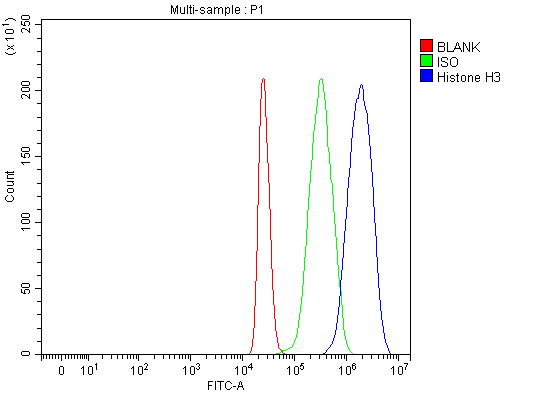 Overlay histogram showing RAW264.7 cells stained with A12477-2 (Blue line). To facilitate intracellular staining, cells were fixed with 4% paraformaldehyde and permeabilized with permeabilization buffer. The cells were blocked with 10% normal goat serum. And then incubated with rabbit anti-Histone H3 Antibody (A12477-2) at 1:100 dilution for 30 min at 20°C. Fluoro488 conjugated goat anti-rabbit IgG (BA1127) was used as secondary antibody at 1:100 dilution for 30 minutes at 20°C. Isotype control antibody (Green line) was rabbit IgG at 1:100 dilution used under the same conditions. Unlabelled sample without incubation with primary antibody and secondary antibody (Red line) was used as a blank control.