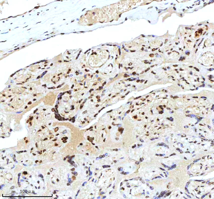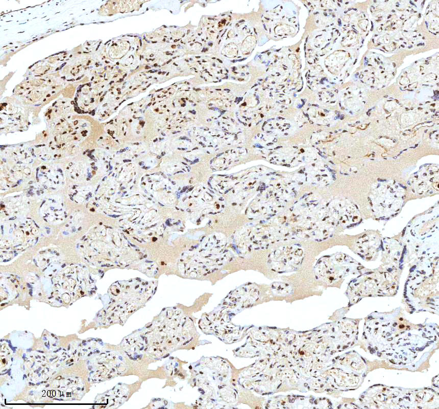 Histone H3 was detected in a paraffin-embedded section of human placenta tissue. The tissue section was incubated with rabbit anti-Histone H3 Antibody (A12477-2) at a dilution of 1:200 and developed using HRP Conjugated Rabbit IgG Super Vision Assay Kit (Catalog # SV0002) with DAB (Catalog # AR1027) as the chromogen.