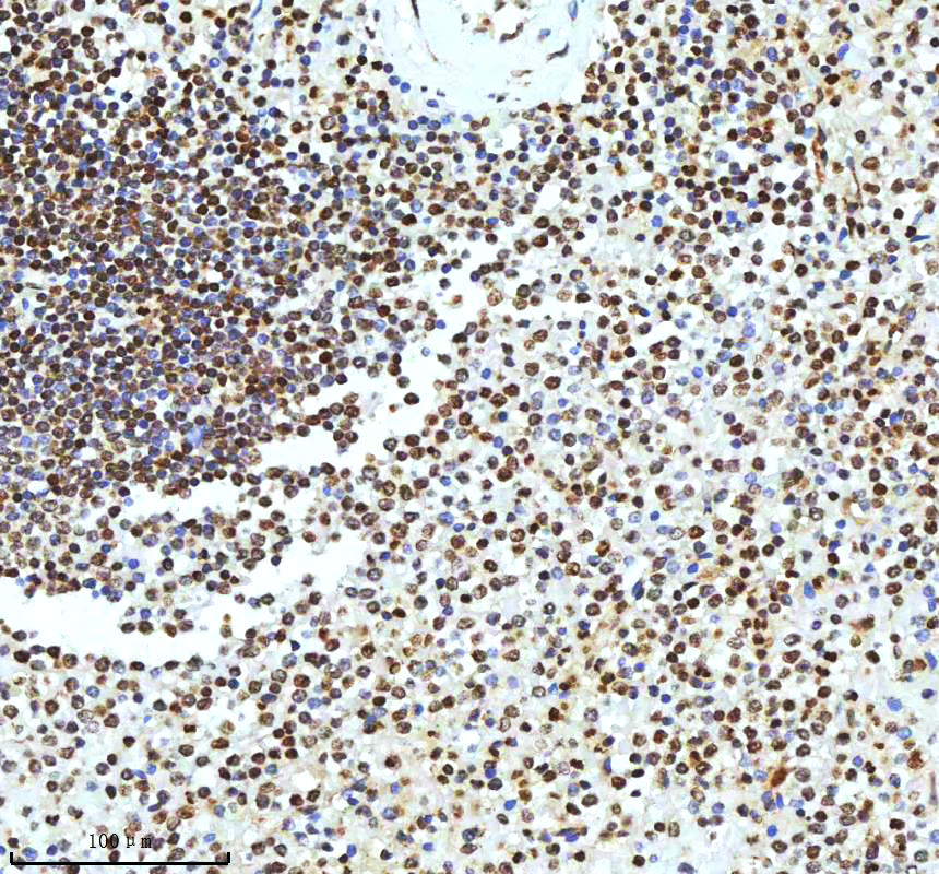 Histone H3 was detected in a paraffin-embedded section of human spleen tissue. The tissue section was incubated with rabbit anti-Histone H3 Antibody (A12477-2) at a dilution of 1:200 and developed using HRP Conjugated Rabbit IgG Super Vision Assay Kit (Catalog # SV0002) with DAB (Catalog # AR1027) as the chromogen.