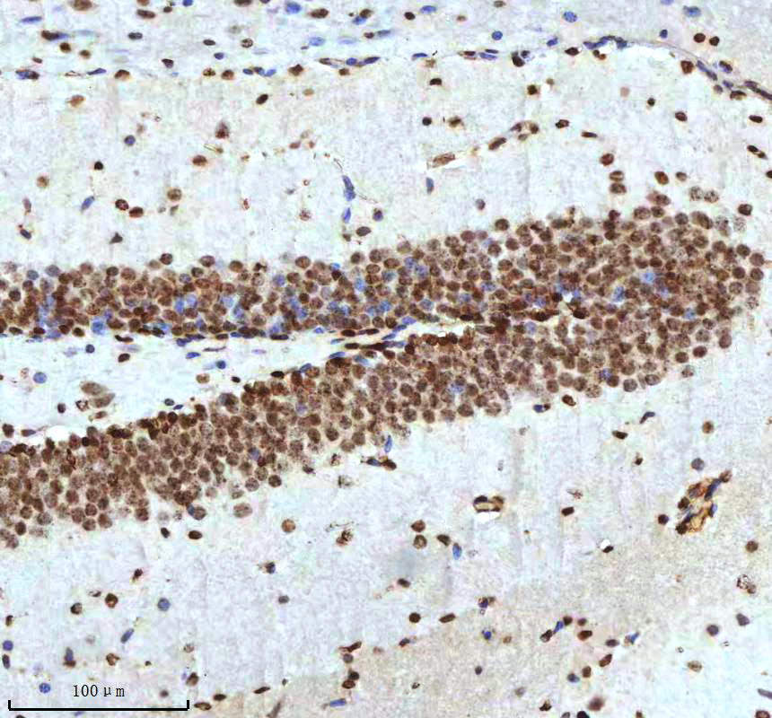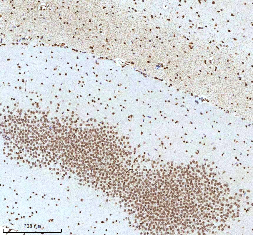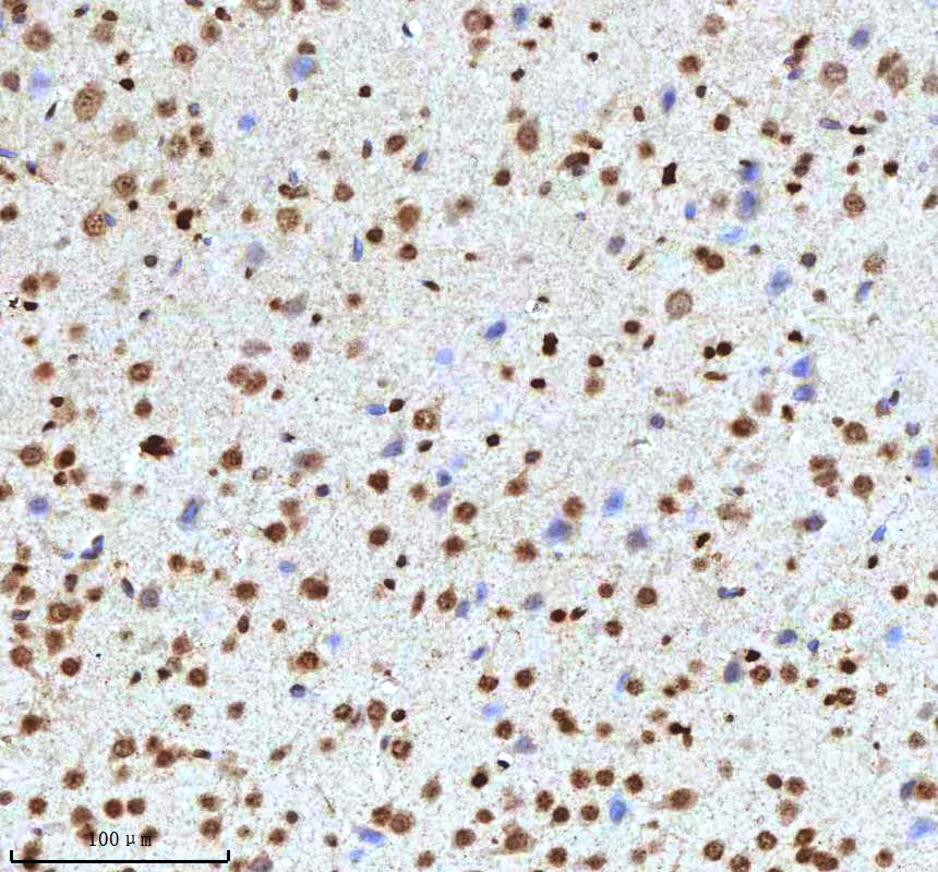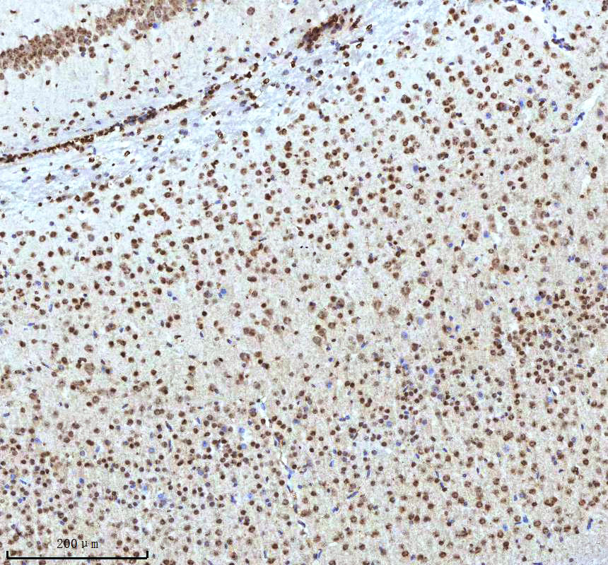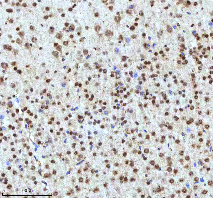Histone H3 was detected in a paraffin-embedded section of mouse brain tissue. The tissue section was incubated with rabbit anti-Histone H3 Antibody (A12477-2) at a dilution of 1:200 and developed using HRP Conjugated Rabbit IgG Super Vision Assay Kit (Catalog # SV0002) with DAB (Catalog # AR1027) as the chromogen.