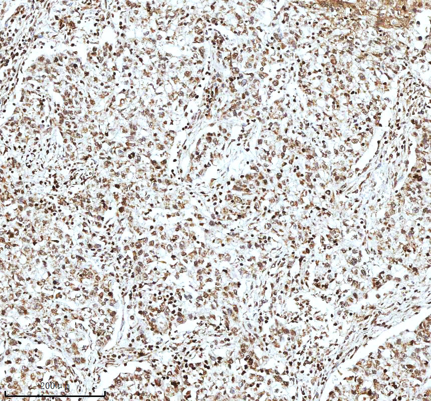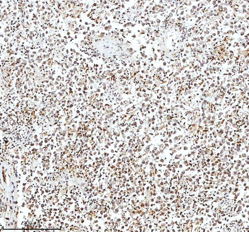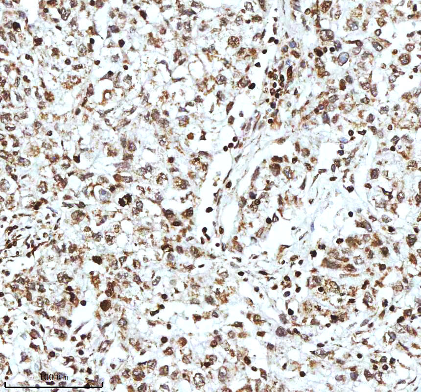 Histone H3 was detected in a paraffin-embedded section of human testicular seminoma tissue. The tissue section was incubated with rabbit anti-Histone H3 Antibody (A12477-2) at a dilution of 1:200 and developed using HRP Conjugated Rabbit IgG Super Vision Assay Kit (Catalog # SV0002) with DAB (Catalog # AR1027) as the chromogen.