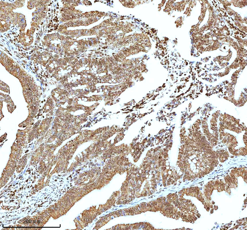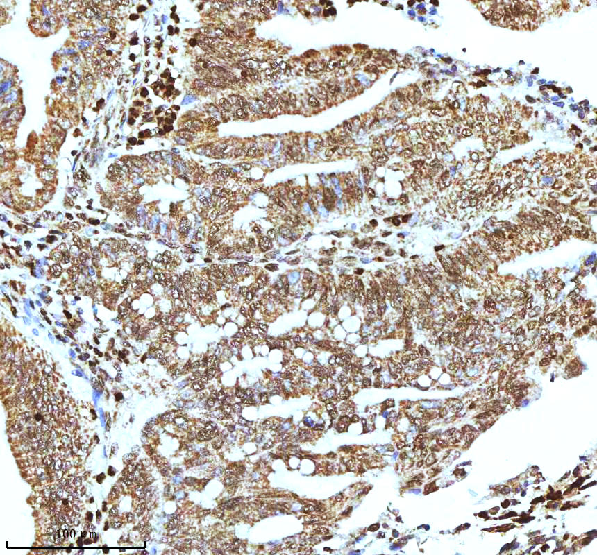 Histone H3 was detected in a paraffin-embedded section of human colon adenocarcinoma tissue. The tissue section was incubated with rabbit anti-Histone H3 Antibody (A12477-2) at a dilution of 1:200 and developed using HRP Conjugated Rabbit IgG Super Vision Assay Kit (Catalog # SV0002) with DAB (Catalog # AR1027) as the chromogen.