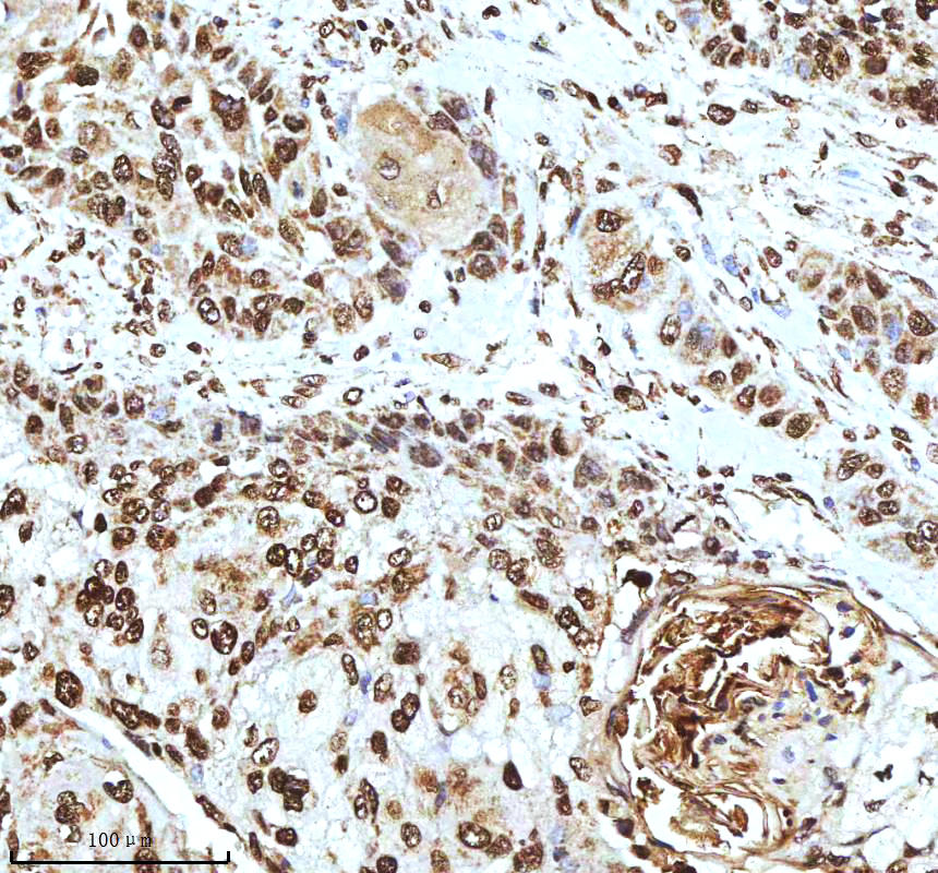 Histone H3 was detected in a paraffin-embedded section of human esophageal squamous carcinoma tissue. The tissue section was incubated with rabbit anti-Histone H3 Antibody (A12477-2) at a dilution of 1:200 and developed using HRP Conjugated Rabbit IgG Super Vision Assay Kit (Catalog # SV0002) with DAB (Catalog # AR1027) as the chromogen.