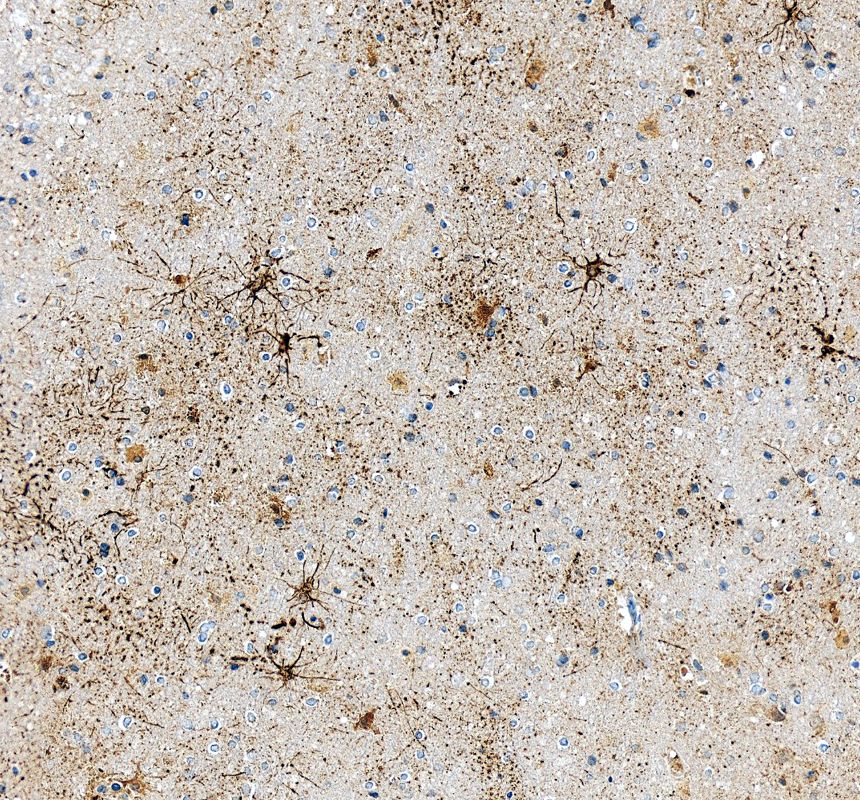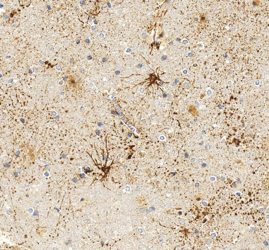 GFAP was detected in a paraffin-embedded section of human brain tissue. The tissue section was incubated with rabbit anti-GFAP Antibody (BA0056) at a dilution of 1:200 and developed using HRP Conjugated Rabbit IgG Super Vision Assay Kit (Catalog # SV0002) with DAB (Catalog # AR1027) as the chromogen.
