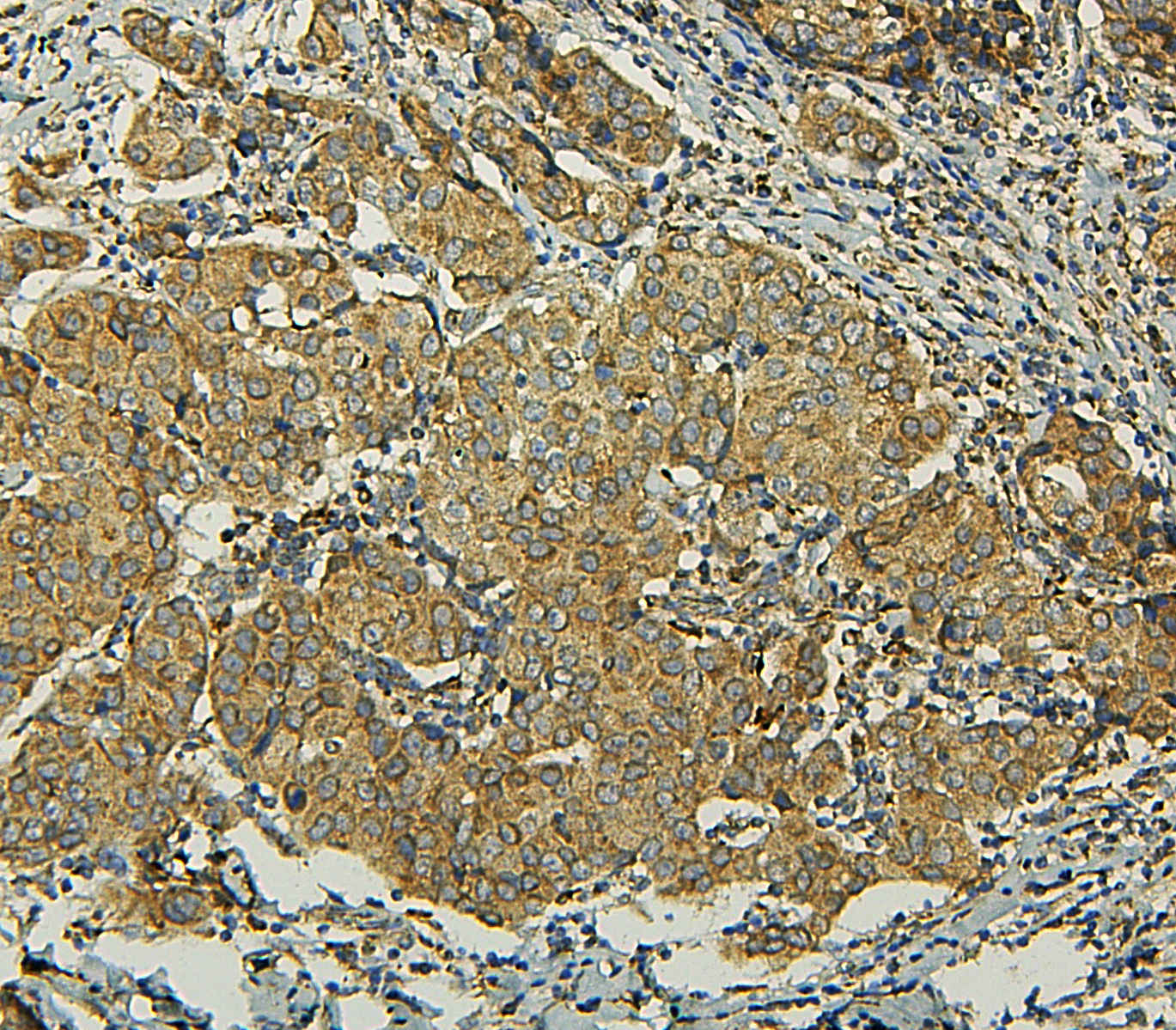 BAK/BAK1 was detected in a paraffin-embedded section of human mammary cancer tissue. Biotinylated goat anti-rabbit IgG was used as secondary antibody. The tissue section was incubated with rabbit anti-BAK/BAK1 Antibody (BA0411) at a dilution of 1:200 and developed using Strepavidin-Biotin-Complex (SABC) (Catalog # SA1022) with DAB (Catalog # AR1027) as the chromogen.