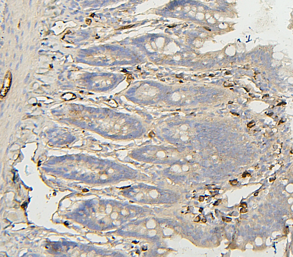 BAK/BAK1 was detected in a paraffin-embedded section of rat intestine tissue. Biotinylated goat anti-rabbit IgG was used as secondary antibody. The tissue section was incubated with rabbit anti-BAK/BAK1 Antibody (BA0411) at a dilution of 1:200 and developed using Strepavidin-Biotin-Complex (SABC) (Catalog # SA1022) with DAB (Catalog # AR1027) as the chromogen.