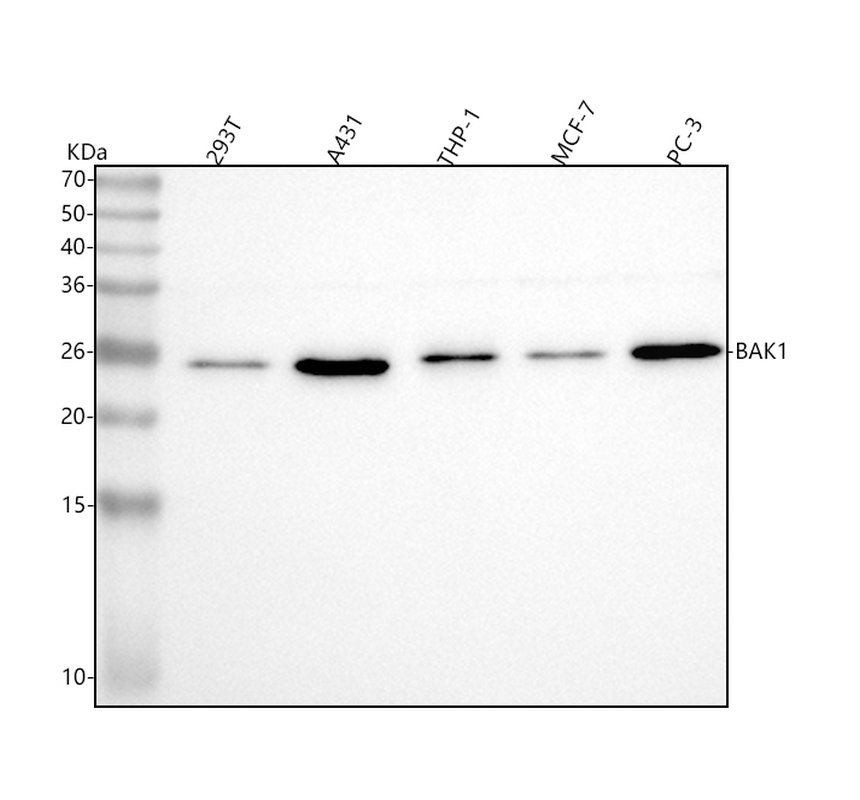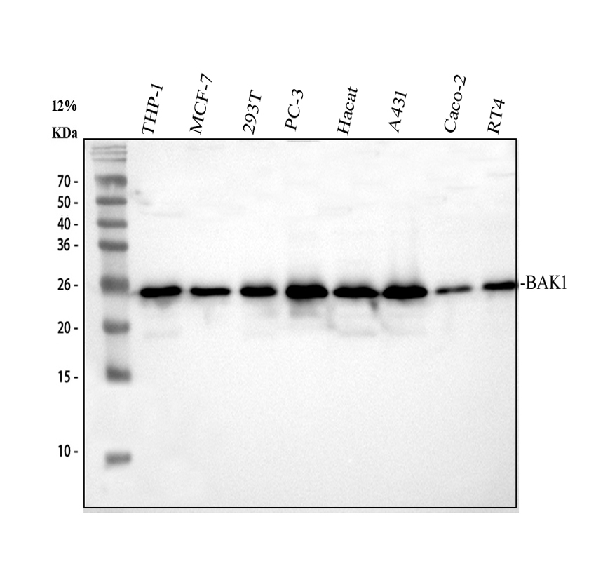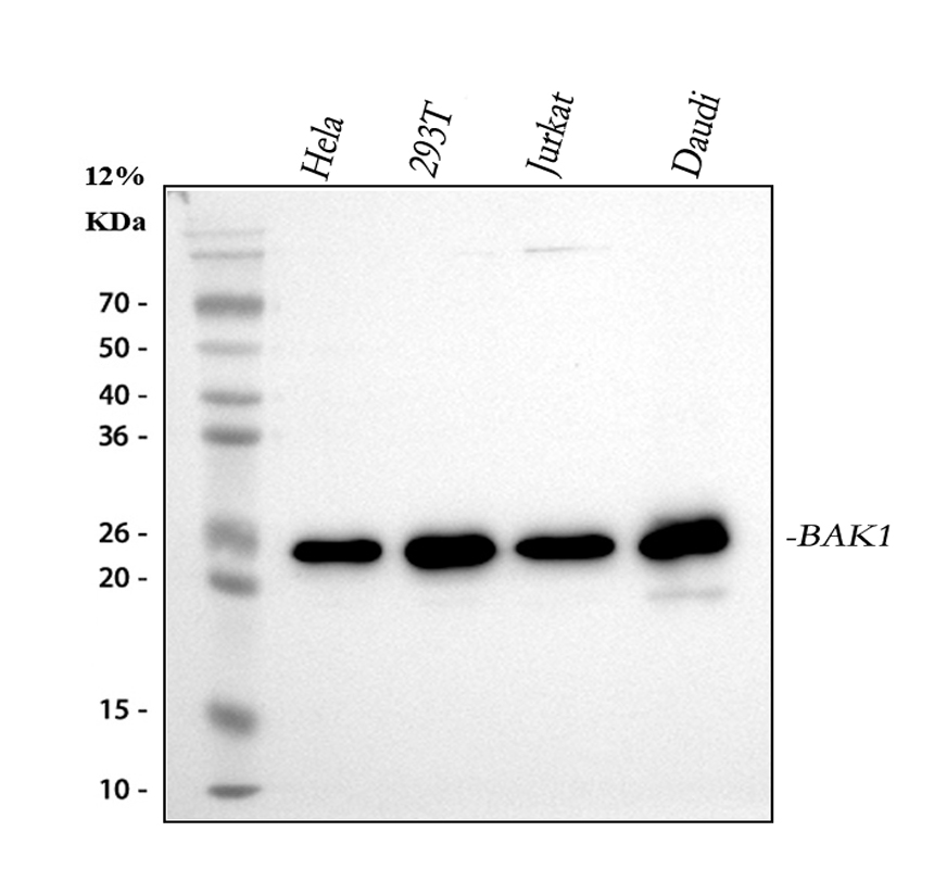 Western blot analysis of BAK/BAK1 using anti-BAK/BAK1 antibody (BA0411). The sample well of each lane was loaded with 30 ug of sample under reducing conditions.