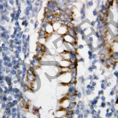 BCL2 was detected in a paraffin-embedded section of human rectal cancer tissue. Biotinylated goat anti-rabbit IgG was used as secondary antibody. The tissue section was incubated with rabbit anti-BCL2 Antibody (BA0412) at a dilution of 1:200 and developed using Strepavidin-Biotin-Complex (SABC) (Catalog # SA1022) with DAB (Catalog # AR1027) as the chromogen.