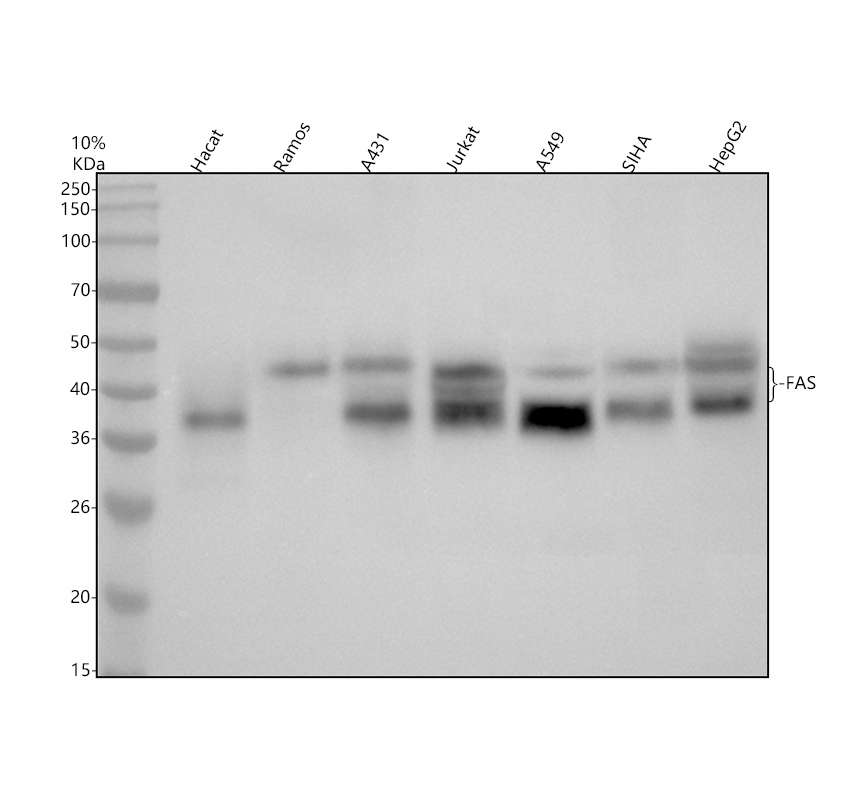 Western blot analysis of CD95/FAS using anti-CD95/FAS antibody (BA0484). The sample well of each lane was loaded with 30 ug of sample under reducing conditions.