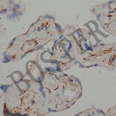 MMP9 was detected in a paraffin-embedded section of human placenta tissue. The tissue section was incubated with rabbit anti-MMP9 Antibody (BA0573) at a dilution of 1:200 and developed using HRP Conjugated Rabbit IgG Super Vision Assay Kit (Catalog # SV0002) with DAB (Catalog # AR1027) as the chromogen.