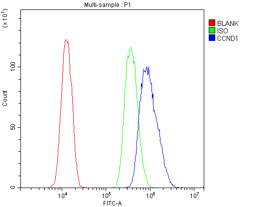 Overlay histogram showing U-87MG cells stained with BA0770-2 (Blue line).The cells were blocked with 10% normal goat serum. And then incubated with rabbit anti-Cyclin D1 Antibody (BA0770-2, 1:100) for 30 min at 20°C. Fluoro488 conjugated goat anti-rabbit IgG (BA1127, 1:100) was used as secondary antibody for 30 minutes at 20°C. Isotype control antibody (Green line) was rabbit IgG (1:100) used under the same conditions. Unlabelled sample (Red line) was also used as a control.