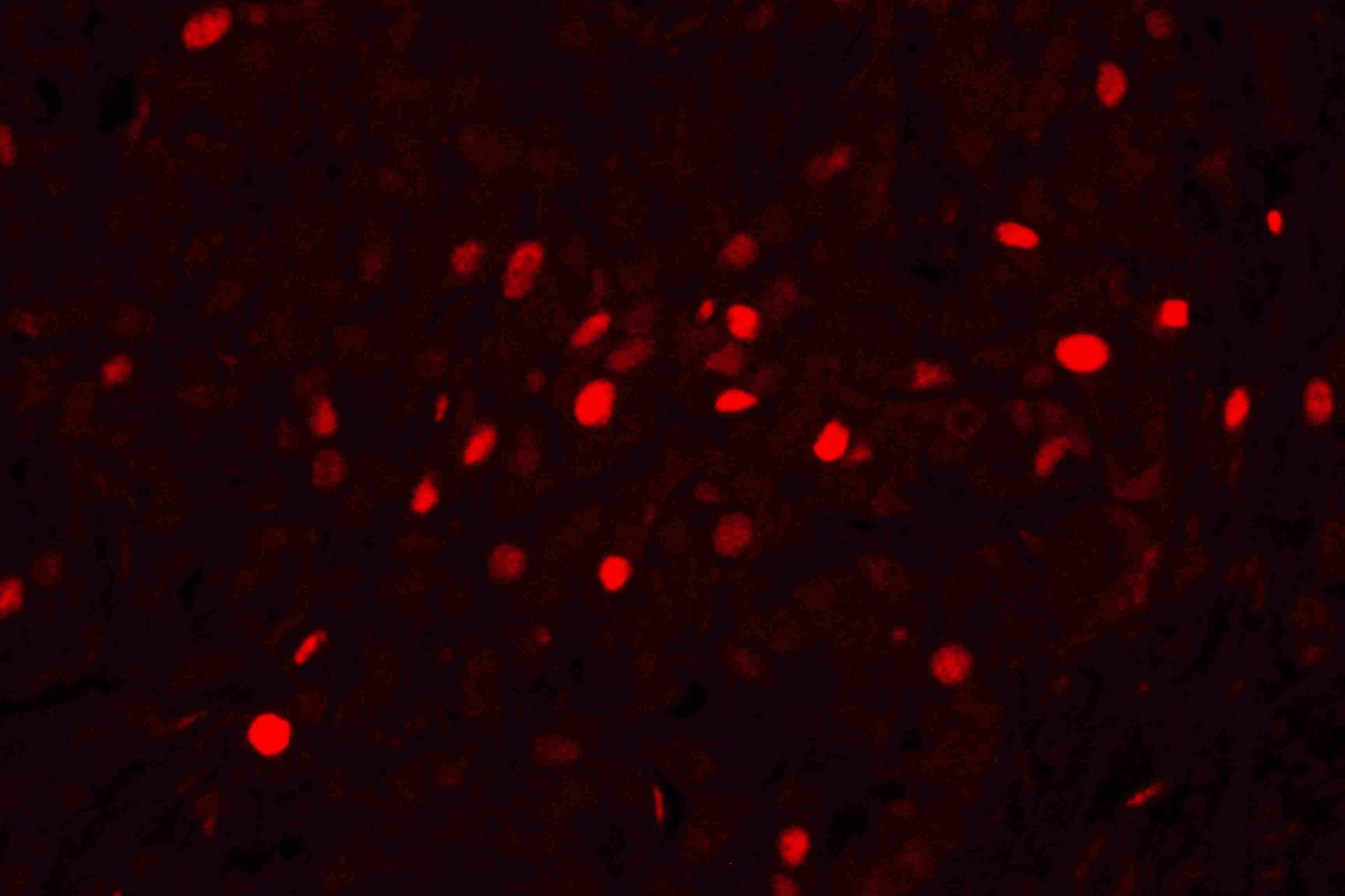 IF analysis using Anti-PCNA antibody(BM0104) detected in paraffin-embedded section of human lung cancer tissue. The tissue section were stained using the TRITC Conjugated AffiniPure Goat Anti-mouse IgG (H+L) Secondary Antibody (red)(Catalog#BA1089) and counterstained with DAPI (blue).