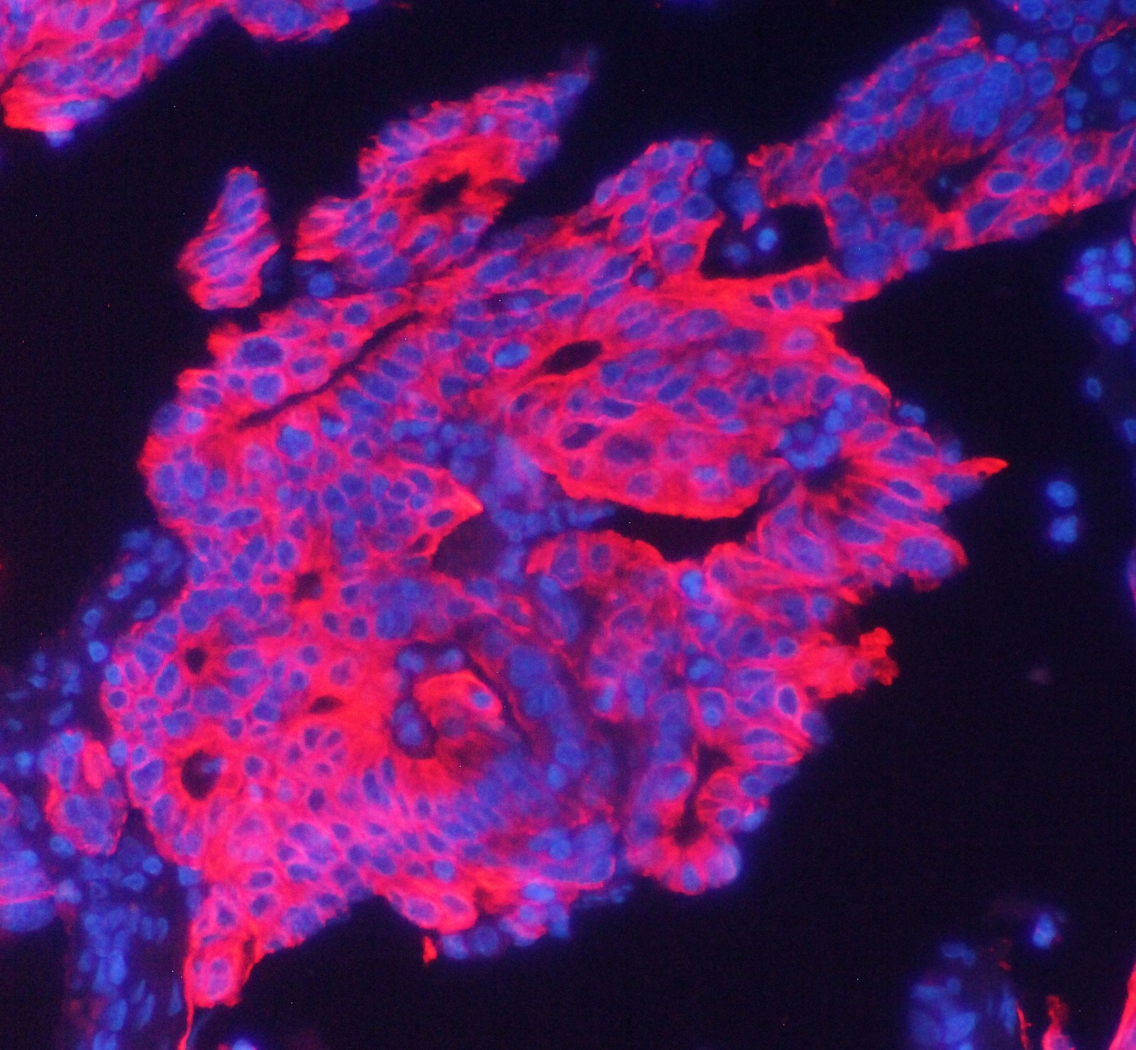 IF analysis using Anti-KRT19 antibody(M02101-2) detected in paraffin-embedded section of intestinal cancer tissue. The tissue section were stained using the Fluoro 550 Conjugated AffiniPure Goat Anti-mouse IgG (H+L) Secondary Antibody (red)(Catalog#BA1133) and counterstained with DAPI (blue).