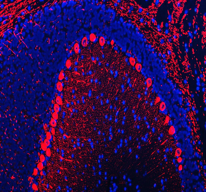 PRKCG was detected in a paraffin-embedded section of rat cerebellum tissue. The tissue section was incubated with rabbit anti-PRKCG Antibody (A01890) at a dilution of 1:100. Fluoro550-conjugated Anti-rabbit IgG Secondary Antibody (red)(Catalog#BA1135) was used as secondary antibody. The section was counterstained with DAPI (Catalog # AR1176) (Blue).