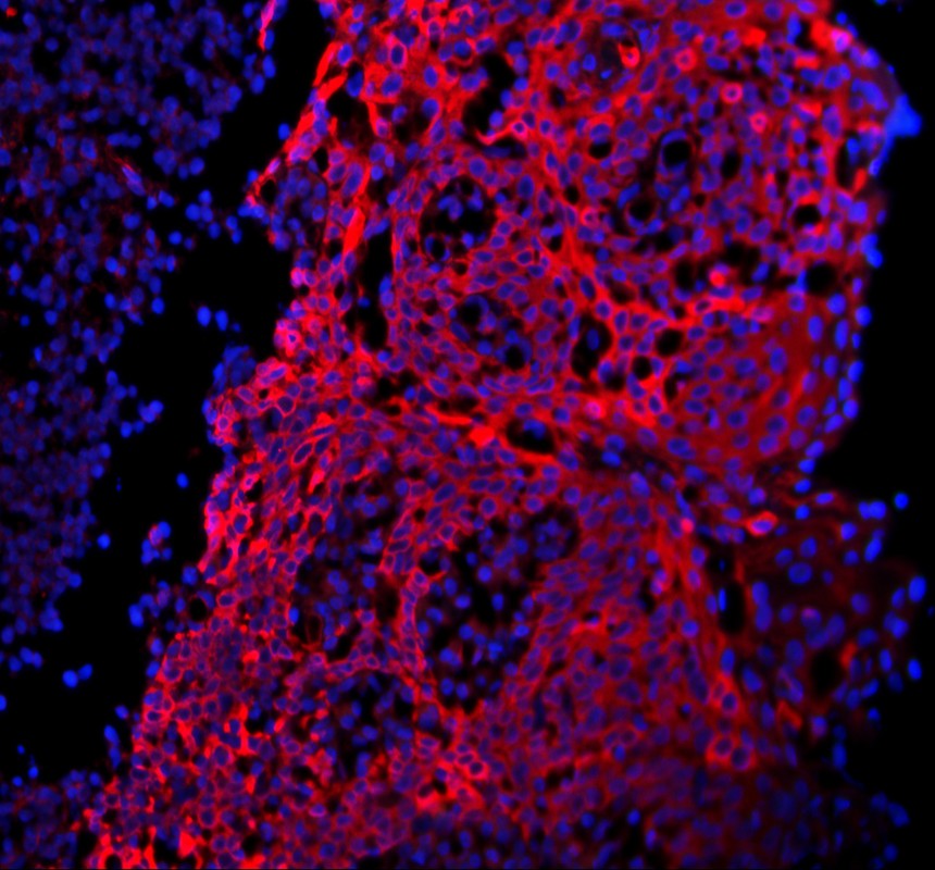 Cytokeratin 18/KRT18 was detected in a paraffin-embedded section of human tonsil tissue. The tissue section was incubated with rabbit anti-Cytokeratin 18/KRT18 Antibody (A01357-1) at a dilution of 1:100. Biotin conjugated goat anti-rabbit IgG (BA1003) was used as secondary antibody and incubated for 30 minutes at 37°C. The tissue section was developed using Fluoro 594 Conjugated Avidin (BA1143). The section was counterstained with DAPI (Catalog # AR1176) (Blue).