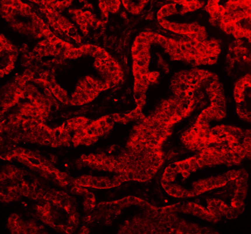 SBK1 was detected in a paraffin-embedded section of human lung cancer tissue. The tissue section was incubated with rabbit anti-SBK1 Antibody (A17120-1) at a dilution of 1:100. Fluoro 550 Conjugated AffiniPure Donkey Anti-Rabbit IgG (H+L) (red)(Catalog#BA1144) was used as secondary antibody.