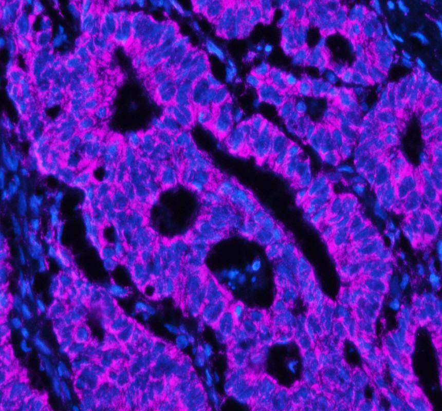 COX5B was detected in a paraffin-embedded section of human intestinal cancer tissue. The tissue section was incubated with rabbit anti-COX5B Antibody (A06090-2) at a dilution of 1:100. Fluoro 647 Conjugated AffiniPure Goat Anti-rabbit IgG (H+L) secondary antibody (Catalog # BA1150) was used as secondary antibody. The section was counterstained with DAPI (Catalog # AR1176) (Blue).