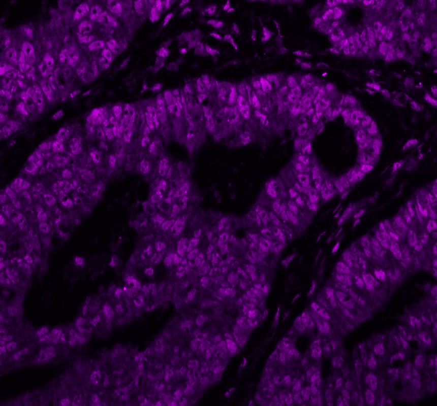 DDX1 was detected in a paraffin-embedded section of human colon cancer tissue. The tissue section was incubated with mouse anti-DDX1 Antibody (M03727) at a dilution of 1:100. Fluoro 647 Conjugated AffiniPure Goat Anti-mouse IgG (H+L) secondary antibody (Catalog # BA1151) was used as secondary antibody. The section was counterstained with DAPI (Catalog # AR1176) (Blue).