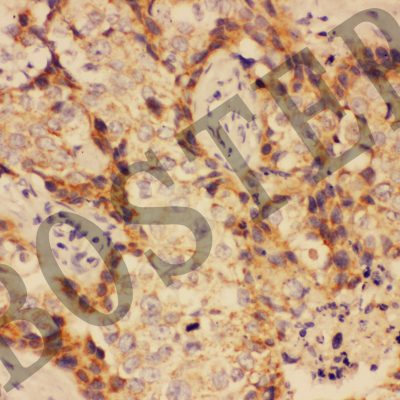 ABCC2 was detected in a paraffin-embedded section of human breast cancer tissue. Biotinylated goat anti-rabbit IgG was used as secondary antibody. The tissue section was incubated with rabbit anti-ABCC2 Antibody (BA1667) at a dilution of 1:200 and developed using Strepavidin-Biotin-Complex (SABC) (Catalog # SA1022) with DAB (Catalog # AR1027) as the chromogen.
