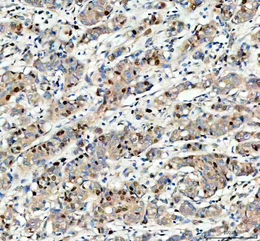 MCM3 was detected in a paraffin-embedded section of human breast cancer tissue. The tissue section was incubated with rabbit anti-MCM3 Antibody (BA2186) at a dilution of 1:200 and developed using HRP Conjugated Rabbit IgG Super Vision Assay Kit (Catalog # SV0002) with DAB (Catalog # AR1027) as the chromogen.