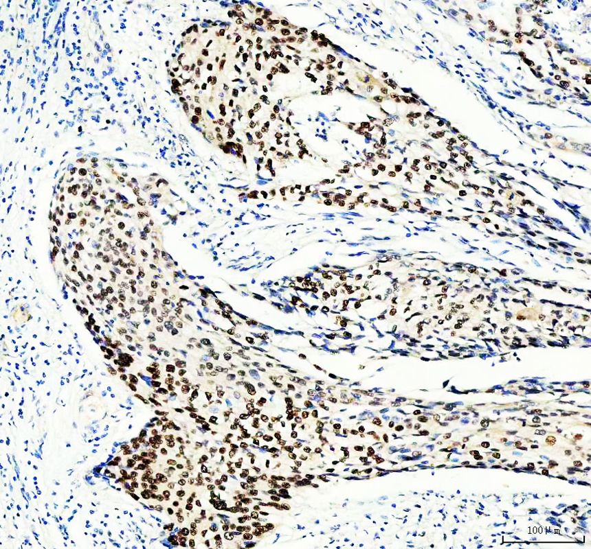 MCM3 was detected in a paraffin-embedded section of human cervical cancer tissue. The tissue section was incubated with rabbit anti-MCM3 Antibody (BA2186) at a dilution of 1:200 and developed using HRP Conjugated Rabbit IgG Super Vision Assay Kit (Catalog # SV0002) with DAB (Catalog # AR1027) as the chromogen.