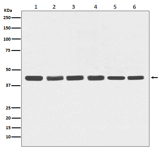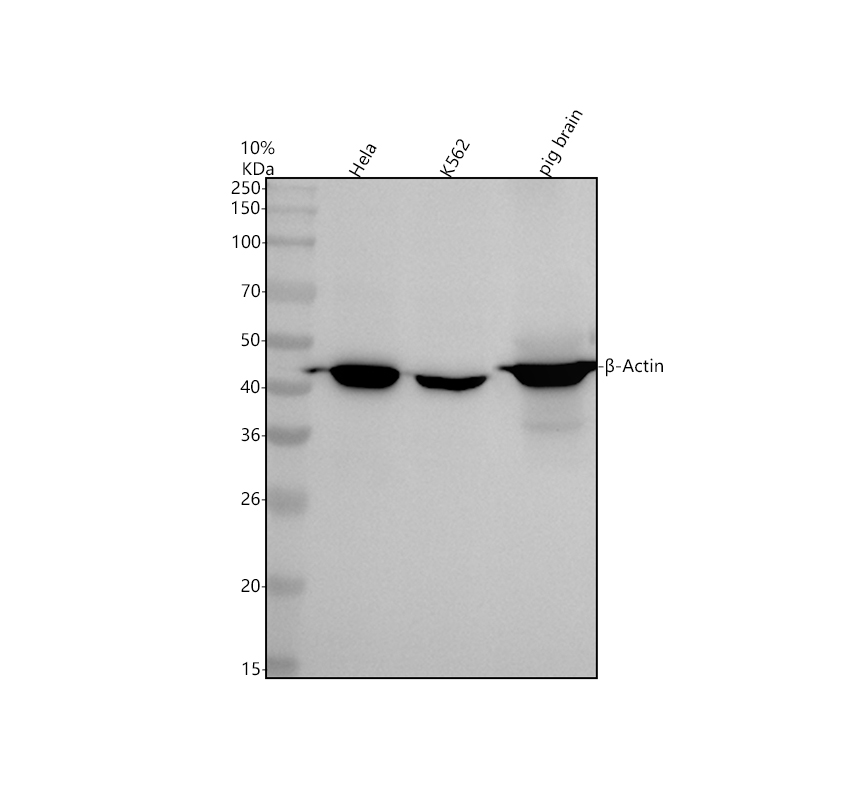 Western blot analysis of Beta Actin/ACTB using anti-Beta Actin/ACTB antibody (BA2305). The sample well of each lane was loaded with 30 ug of sample under reducing conditions.